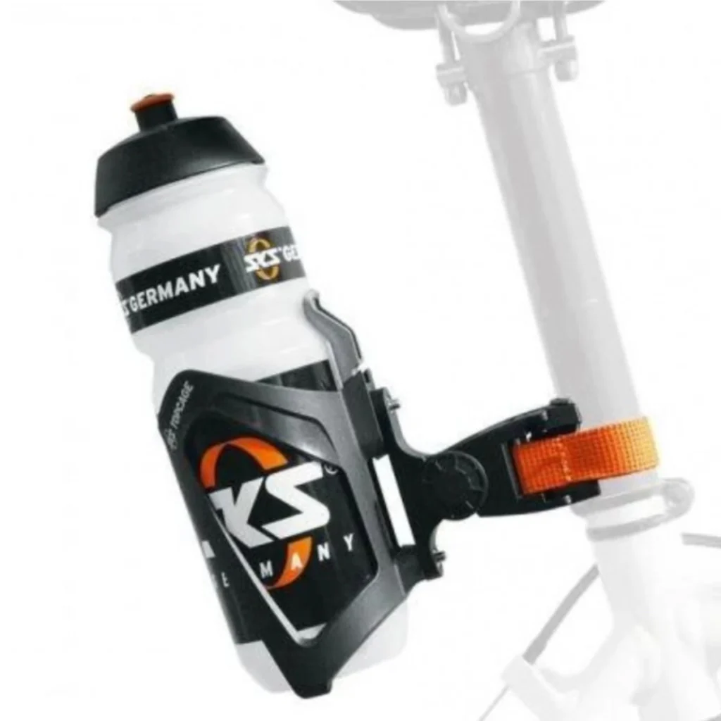 Adaptador portabidón en la tija del sillín. Ajuste del ángulo con solo presionar un botón. Compatible con los portabidones de bicicleta habituales. Accesorio de liberación rápida. R3303 Adaptador SKS portabidón
