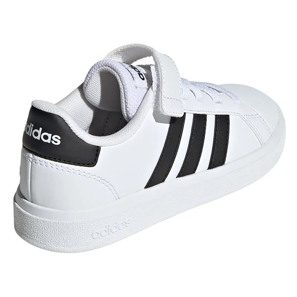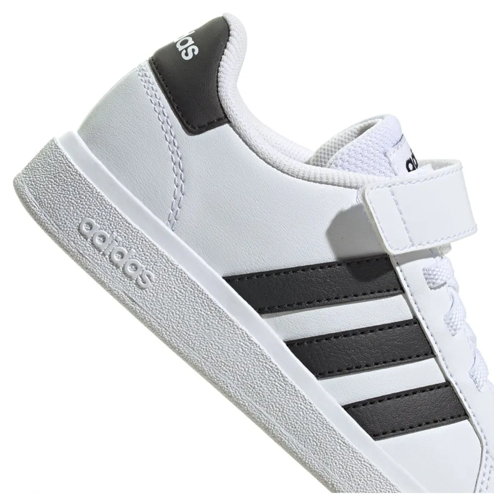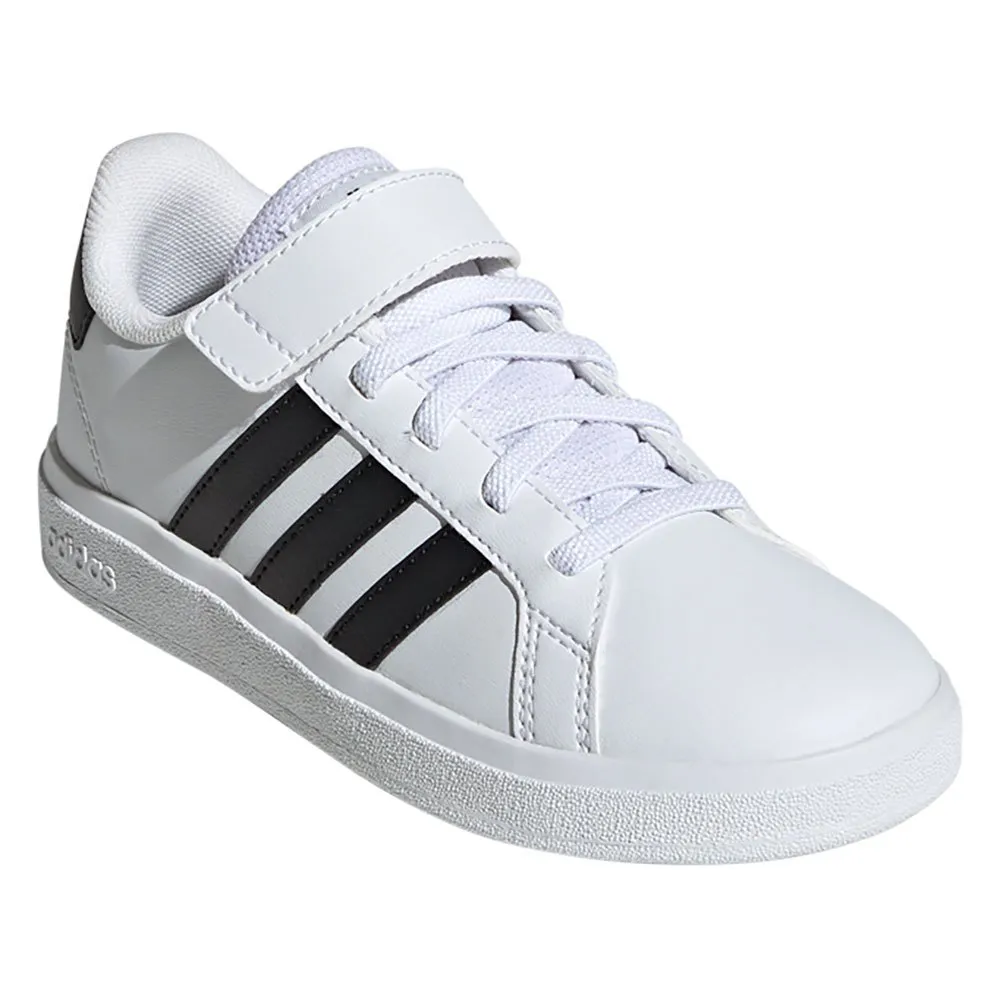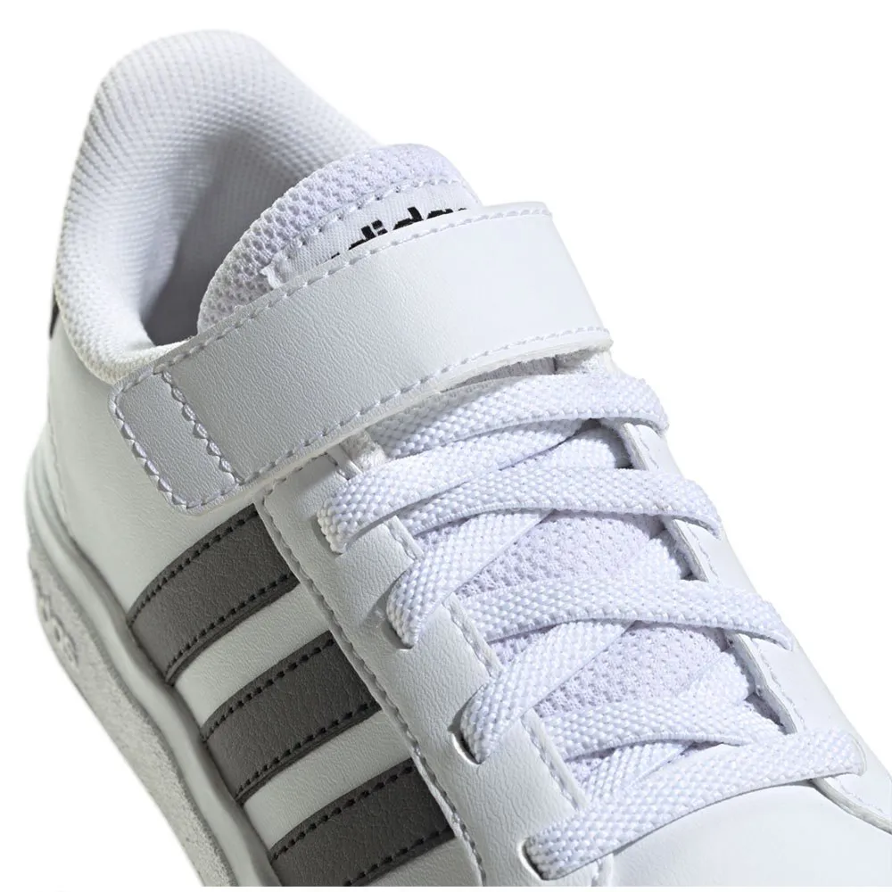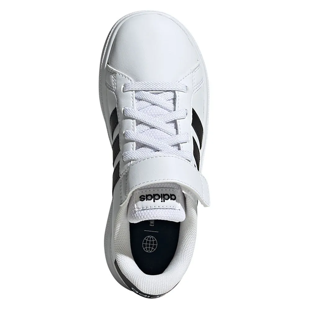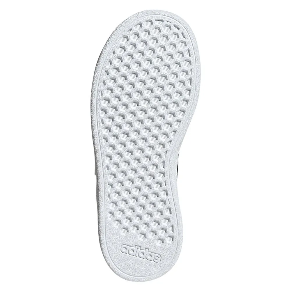Las zapatillas adidas Grand Court 2.0 con velcro infantil presentan cordones elásticos y una tira de velcro para poner y quitar fácilmente. Su parte superior de piel sintética resistente al desgaste le permite jugar, patalear y saltar charcos sin preocupaciones. La parte superior contiene al menos un 50% de materiales reciclados. Su objetivo es plantear otra solución más que ayude a eliminar los residuos plásticos.