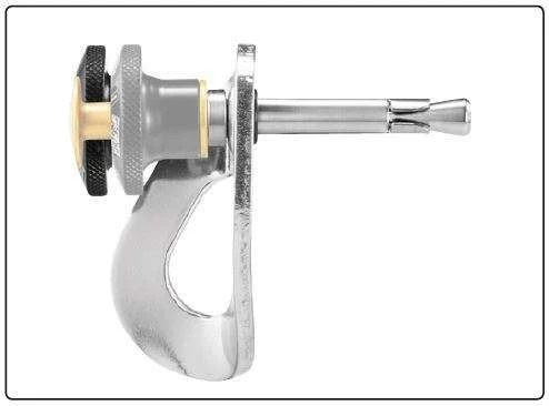 - Anclaje temporal de 8 mm, compuesto por una plaqueta de aluminio y una clavija de acero, destinado a la suspensión y al equipamiento en espeleología.