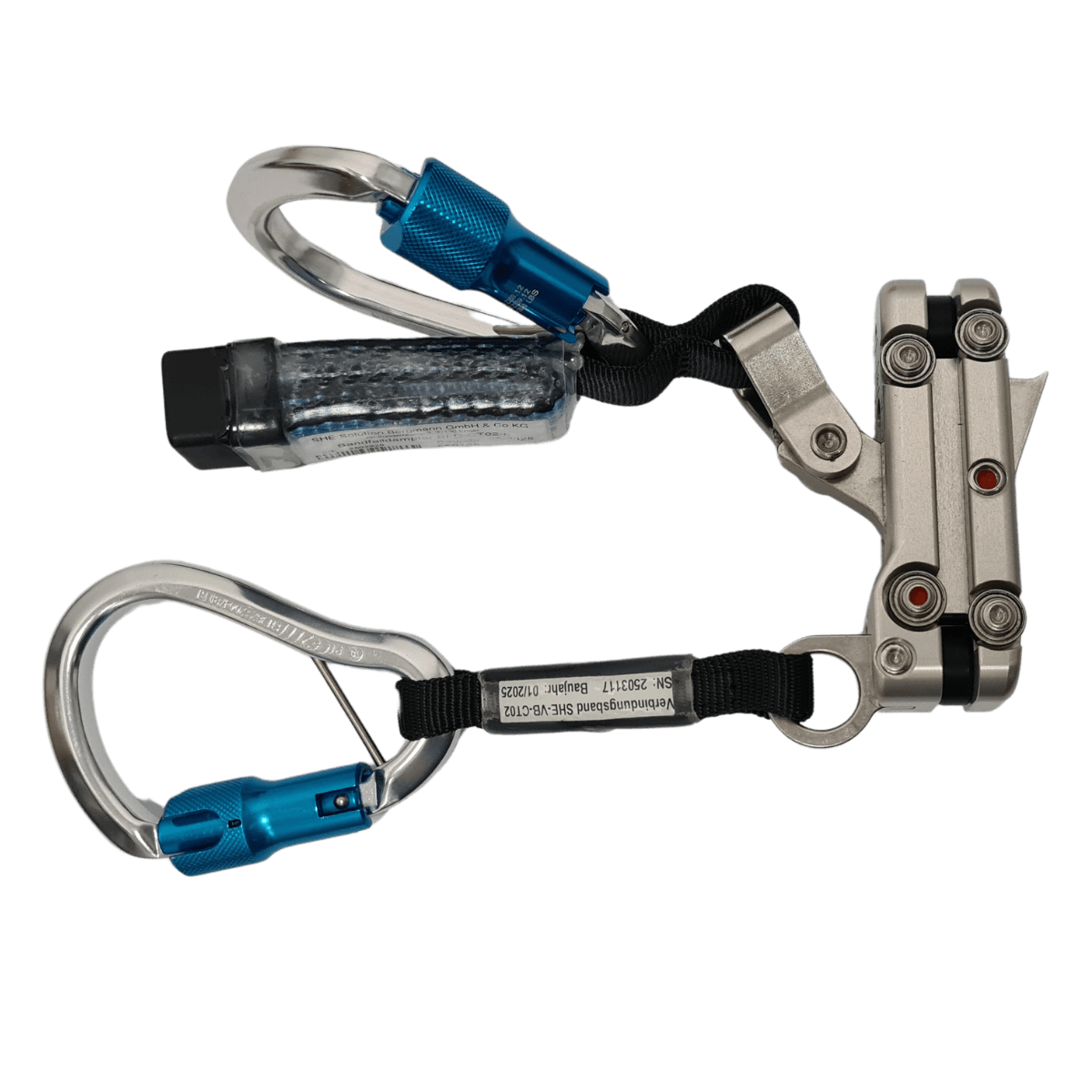 El Climbtec CT-02 se conecta al usuario mediante el ojal de protección de escalada del arnés. En caso de caída, el CT-02 se bloquea en el sistema de rieles LMB y sujeta a la persona que se desea asegurar. La fuerza de caída se reduce a menos de 6 kN gracias al absorbedor de energía integrado. Un dispositivo de seguridad en los extremos de entrada y salida del sistema de rieles LMB impide que el anticaídas se deslice accidentalmente.