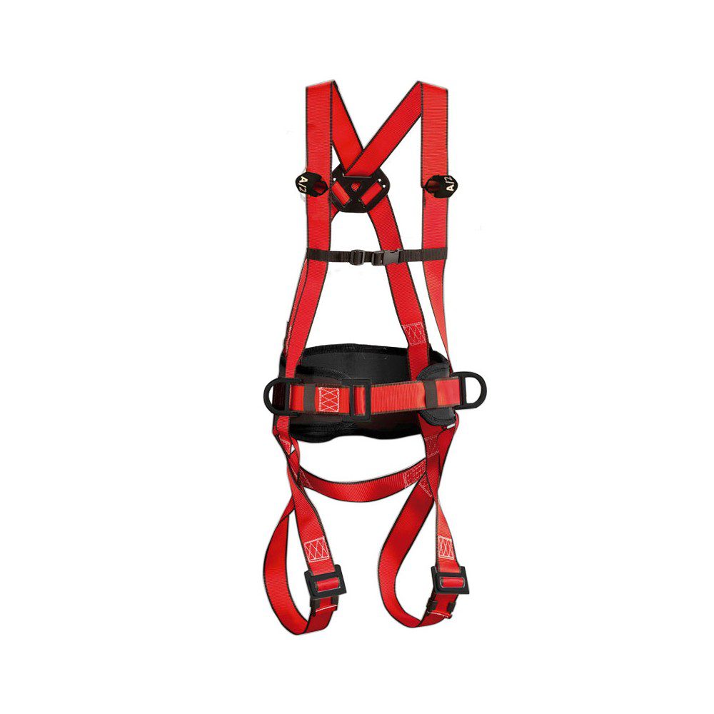 El cinturón permite al usuario amarrarse a la estruc-tura en la que esté trabajando quedando éste sujeto de forma firme y segura. Contiene una banda dorsal acolcha-da mediante relleno de espuma y de una banda de cintura de poliéster de rojo de 45 mm altamente resistente. Incor-pora dos hebillas en forma de “D” que hacen de puntos de sujeción.