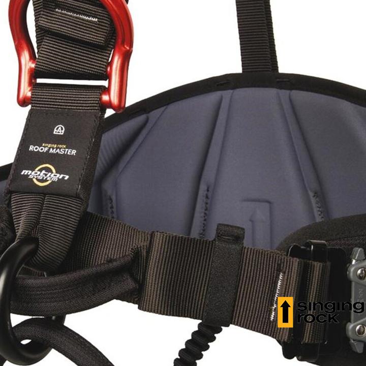 - Los lazos textiles laterales para el posicionamiento de trabajo EN 358 están resaltados con costura roja y se pueden utilizar como máximo para dos mosquetones