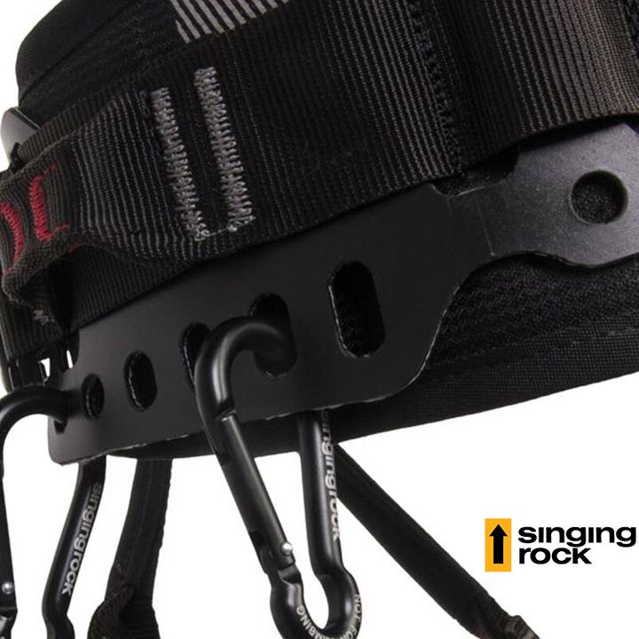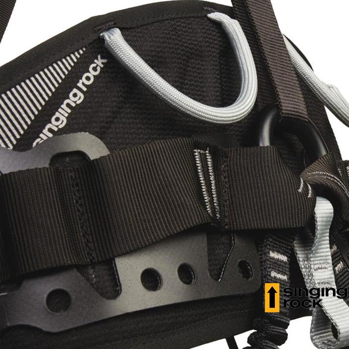 - El cinturón 3D está equipado con un tejido de goma resistente con varios orificios de sujeción a través de los cuales se puede pasar el cordón de reep para crear diferentes tipos de bucles, o al que se pueden unir los mosquetones adicionales para la bolsa de herramientas (la capacidad de carga máxima de cada hoyo es de 10 kg)