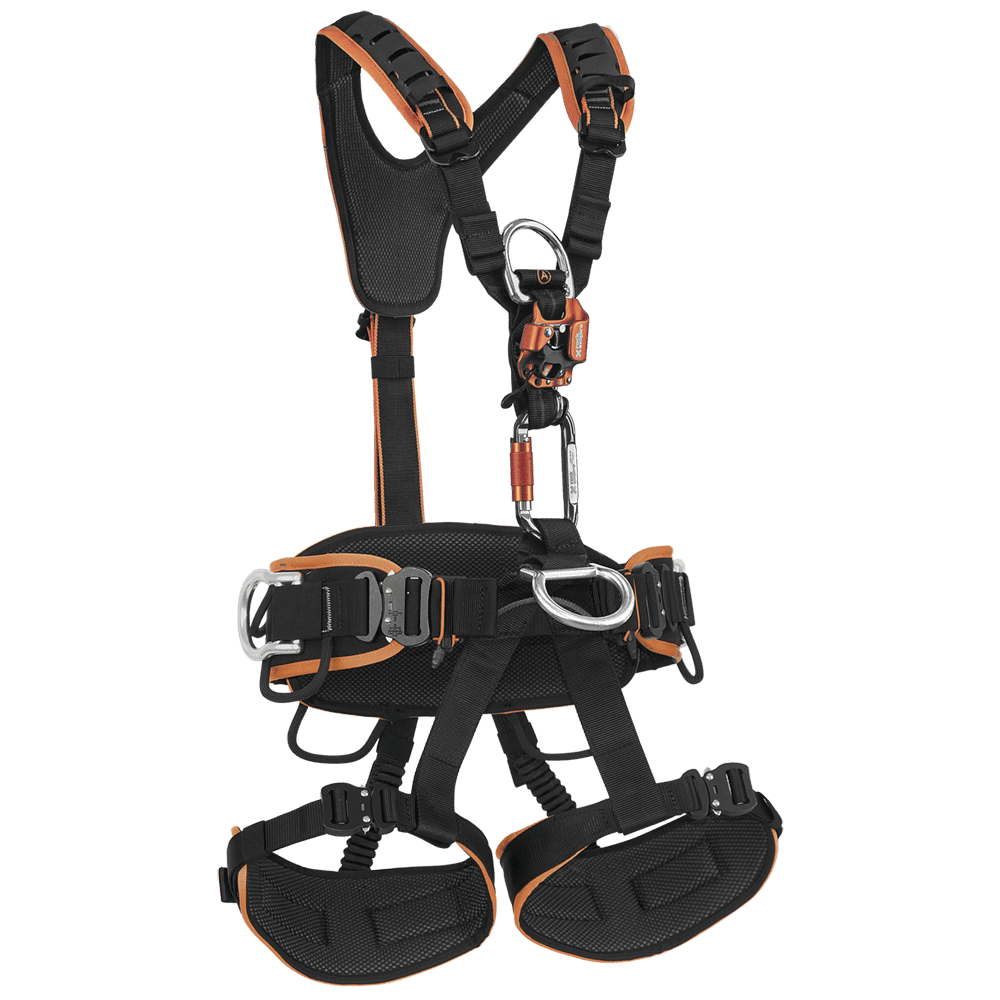 La parte del pecho del arnés está equipada con un bloqueador de pecho ligero y compacto Chest Up, diseñado para uso profesional en sistemas de acceso por cuerda. Chest Up es único en el sentido de que incluye una pieza giratoria. El arnés también es cómodo gracias al cinturón acolchado reforzado y las correas para las piernas.