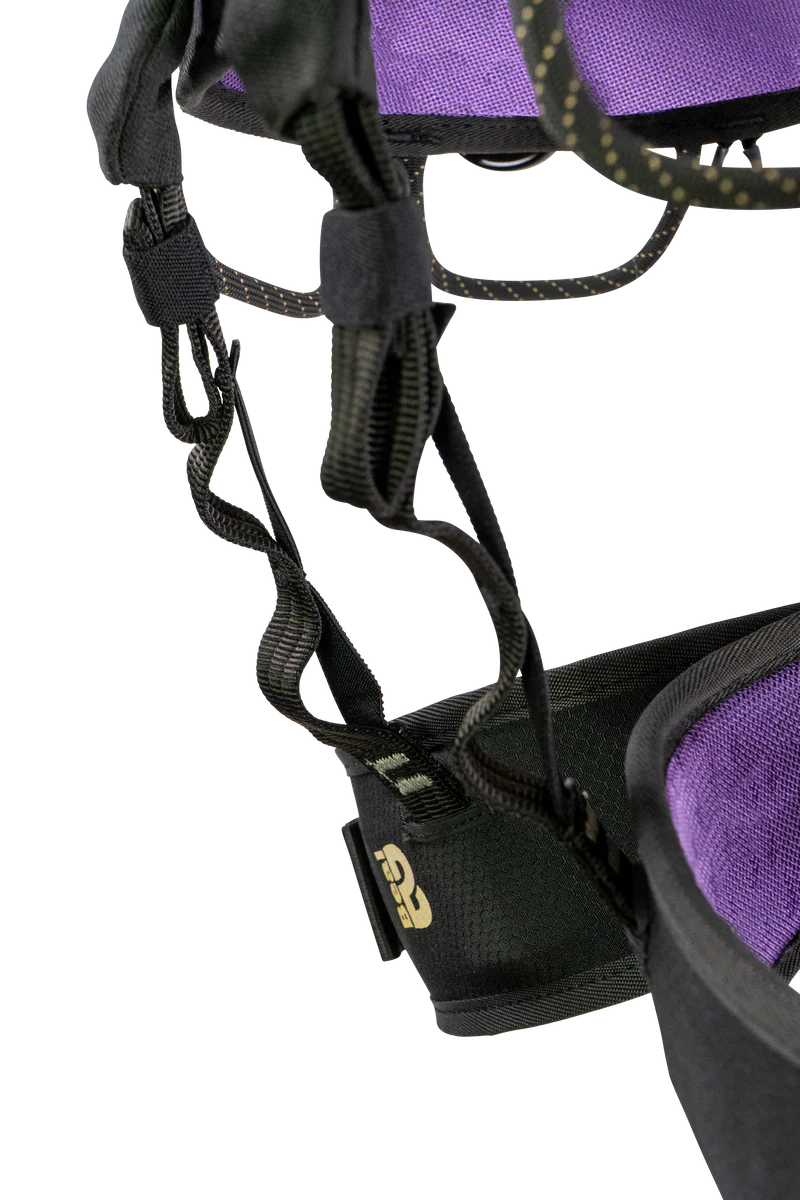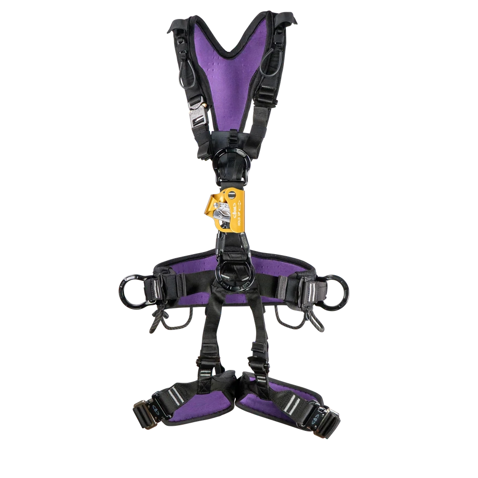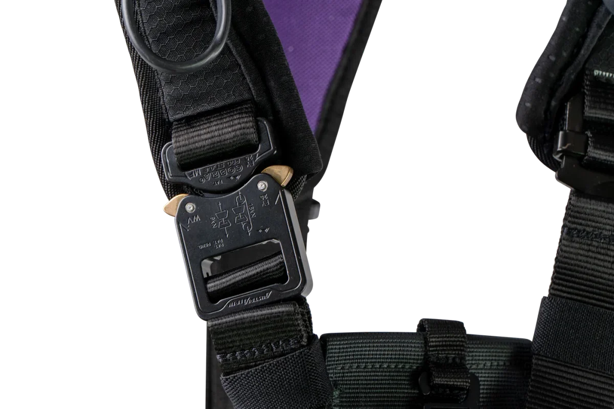 El arnés está equipado con hebillas de doble acción de liberación rápida en las perneras y una hebilla COBRA en el hombro derecho, lo que permite colocarlo sin quitarse el casco ni reajustar las correas. Sus puntos de enganche esternal, dorsal, lateral y ventral cubren todas las situaciones de trabajo: