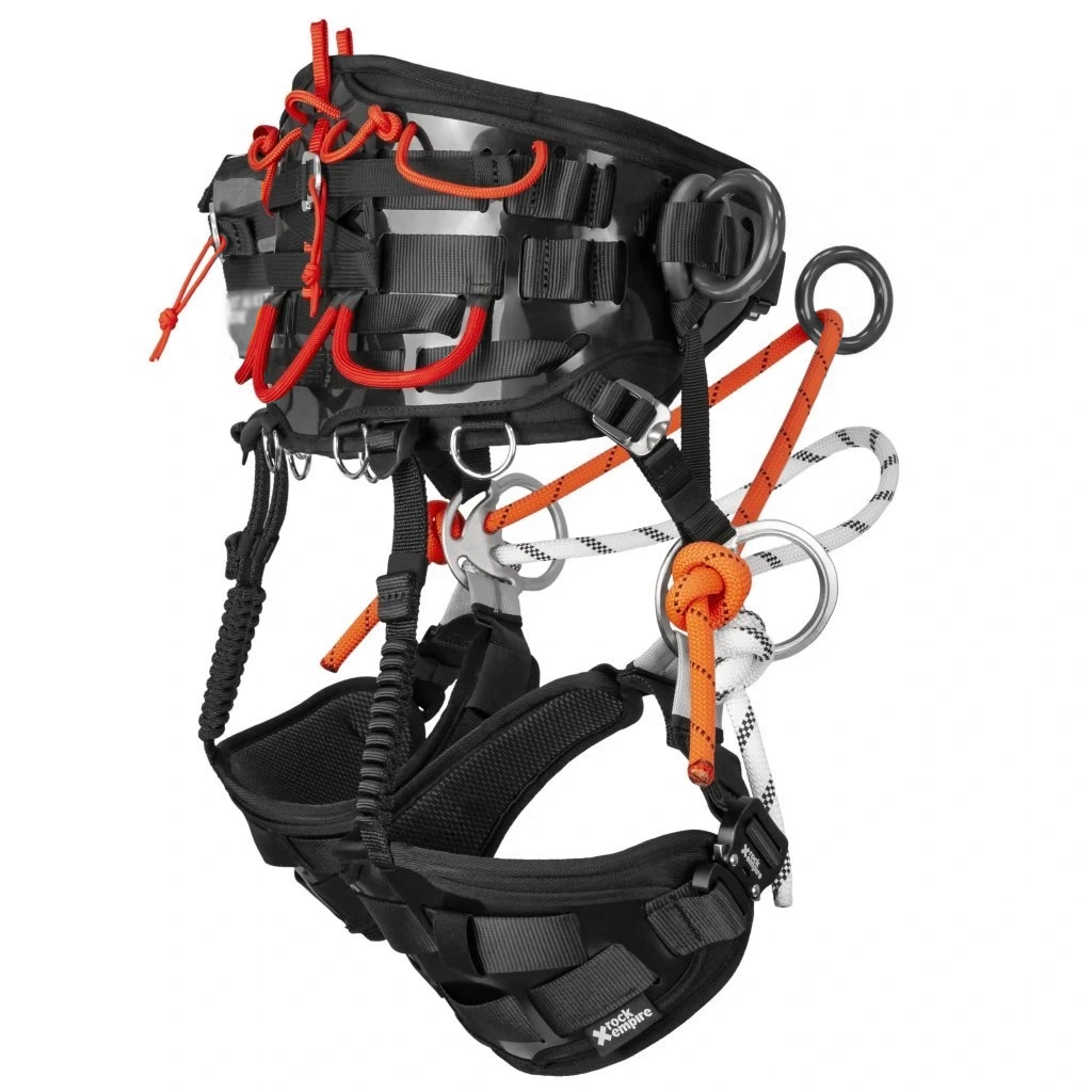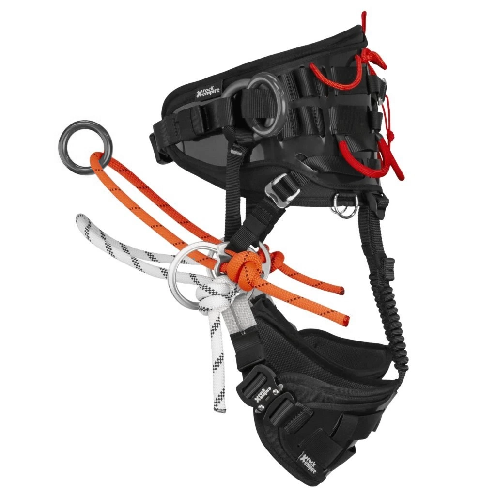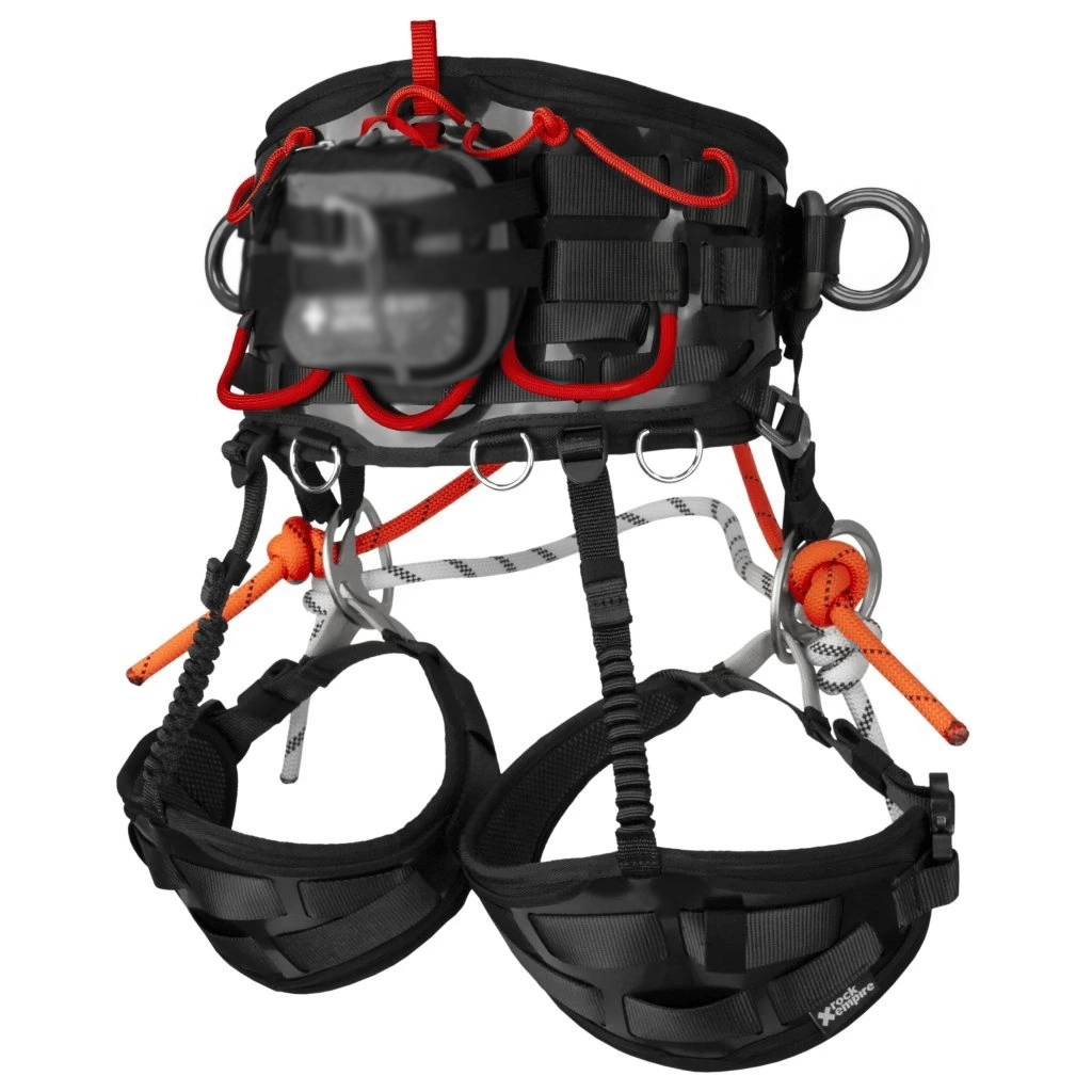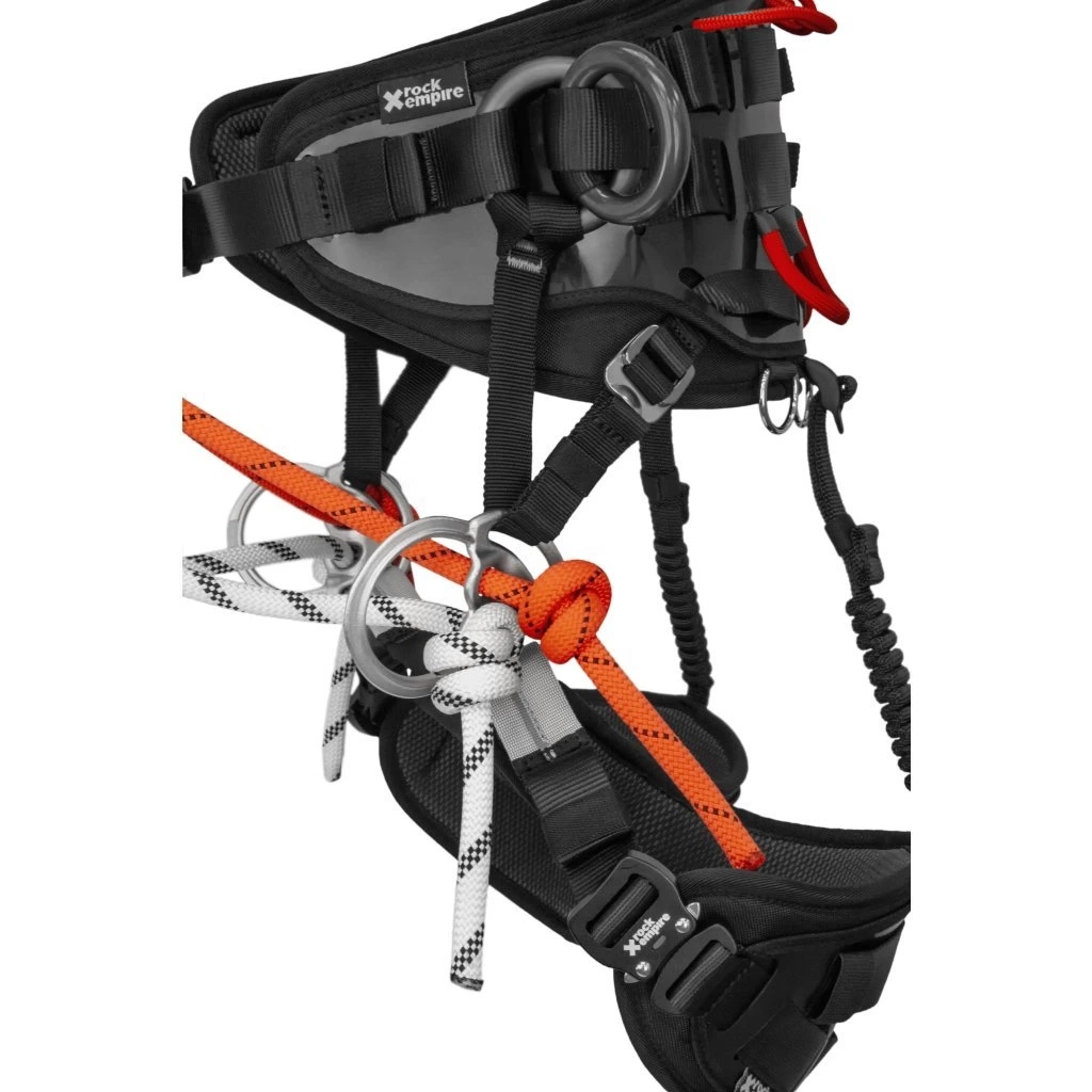 Los cinturones de las piernas están conectados al cinturón en la parte trasera con una correa elástica ajustable, hecha de un material robusto y muy duradero. La ergonomía del arnés se puede ajustar aún más mediante correas ajustables (ancho 20 mm), que se pueden utilizar para acercar las piernas al cinturón en los lados y así ajustar el ángulo óptimo entre las piernas y el cinturón para una suspensión cómoda. en la cuerda. Estas correas son reemplazables en caso de daño o desgaste. Los nuevos arneses para arbolistas SHERMAN y los populares Rock Empire SKILL TREE se fabrican en Europa con materiales de la más alta calidad para una máxima durabilidad.
