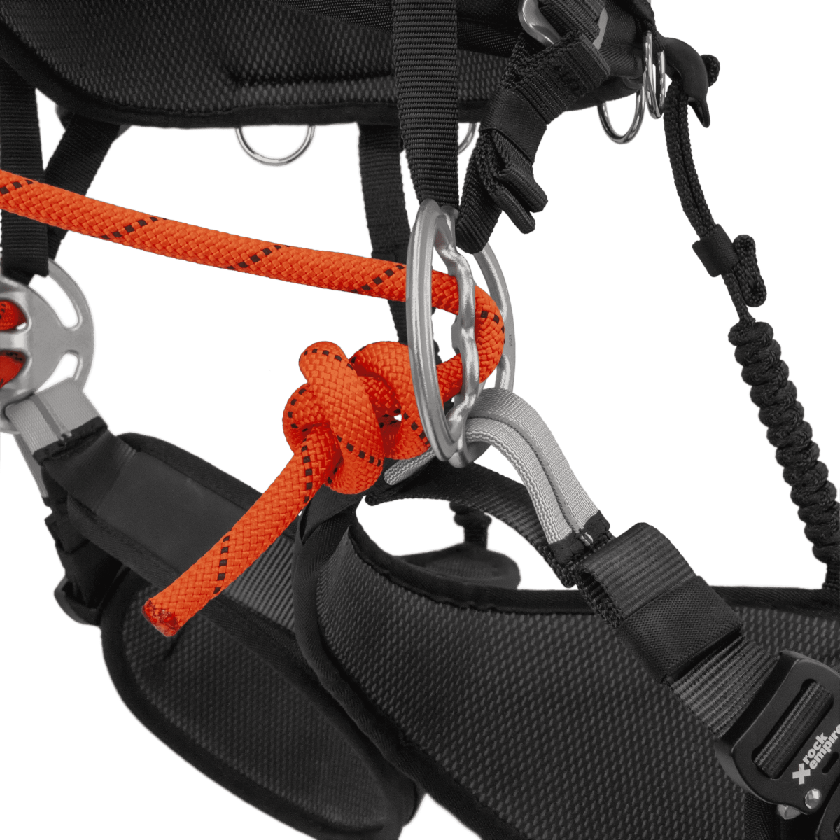 anillo en D de acero inoxidable, siempre en un orificio separado y optimizado para cuerdas estáticas de 11 mm. La longitud de los puentes se puede ajustar fácilmente mediante los nudos al final de las cuerdas. Ambos puentes de cuerda son fácilmente reemplazables en caso de daño o desgaste excesivo. El arnés también dispone de dos puntos de fijación de posicionamiento (EN 358) en los laterales del arnés.