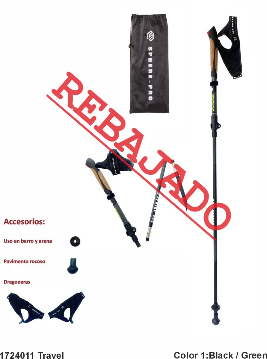 - Bastones plegables en tres tramos, punta de acero de tungsteno y bolsa de transporte de nylon.