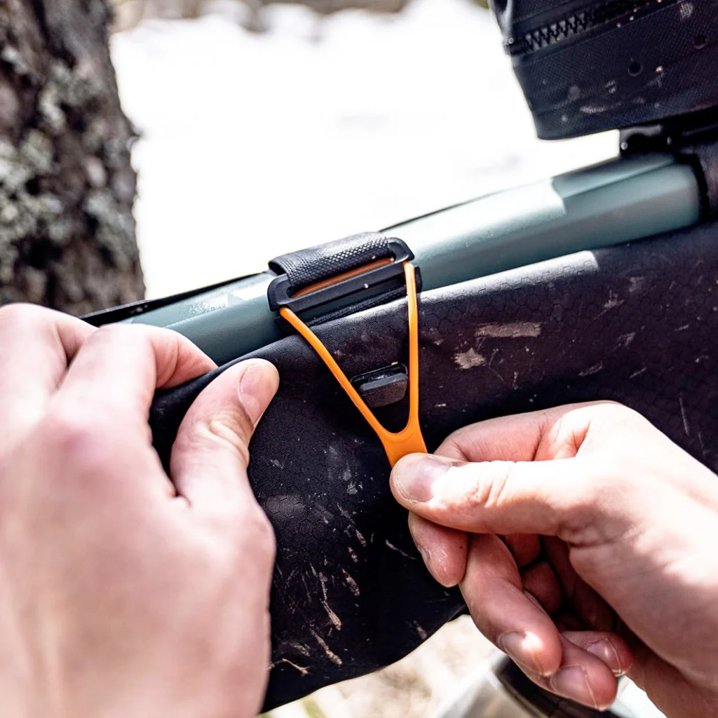 Es la solución para todos que a pesar de llevar su equipaje en el cuadro no desean renunciar a sus bidones. Asimismo, la bolsa impermeable del cuadro con cierre enrollable es ideal para todos los MTBs con suspensión completa, cuyo amortiguador limita el espacio dentro del triángulo del cuadro. Gracias al cierre enrollable impermeable asegurado con anillos de silicona, la bolsa de la serie Bikepacking cumple el estándar IP65, con lo que protege el equipaje contra el agua. El Frame-Pack RC Toptube permite acoger objetos pesados del equipaje como las varillas de la tienda, herramientas o comida dentro del triángulo del cuadro, contribuyendo con ello a un punto de gravedad bajo en la bicicleta. Los cierres de velcro de posicionamiento variable, estable y de gran adherencia garantizan un montaje sencillo y poco complicado en el tubo superior y el tubo de asiento de la bicicleta.