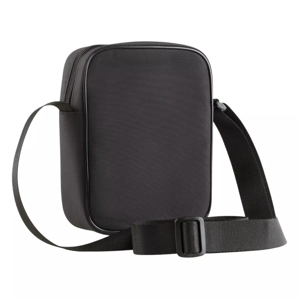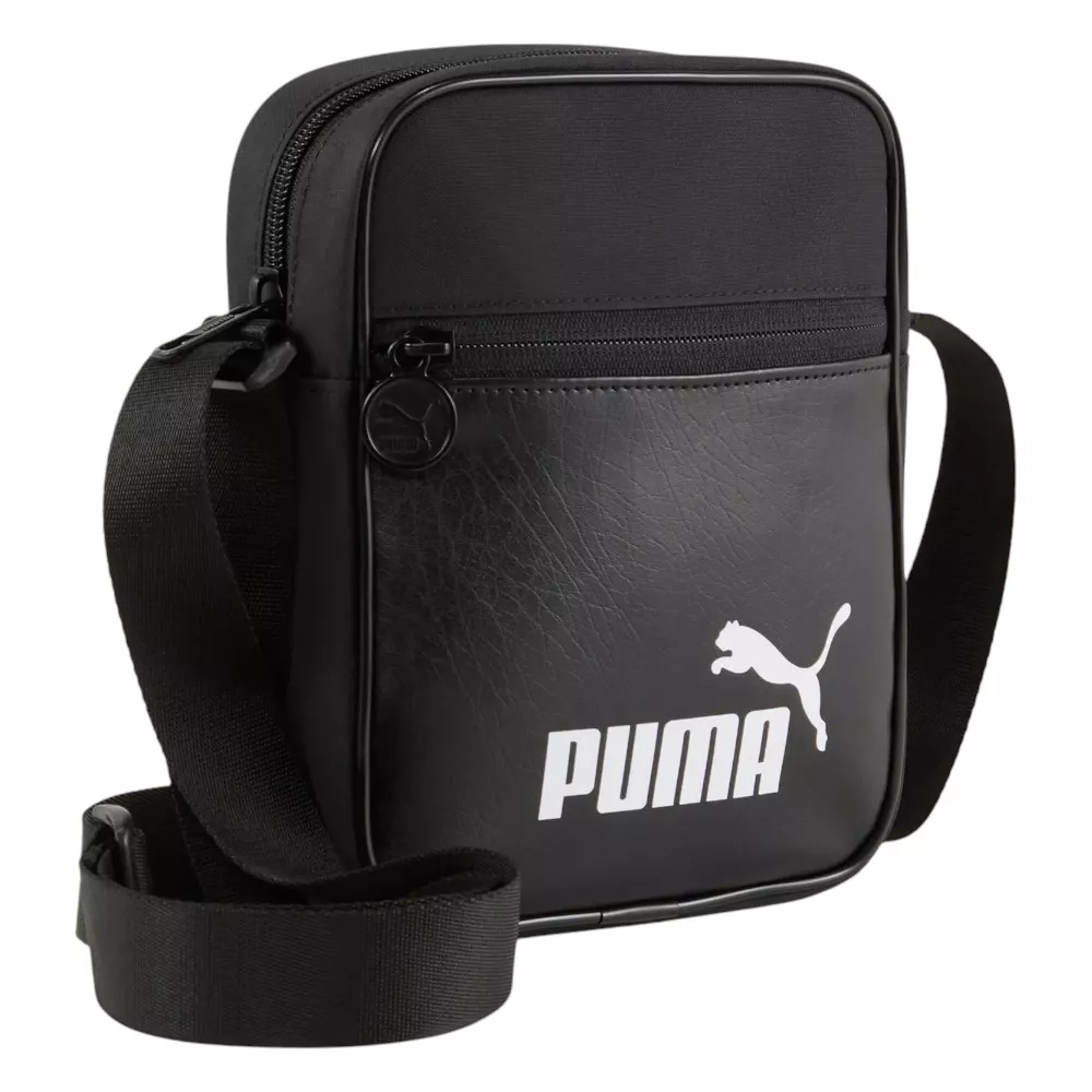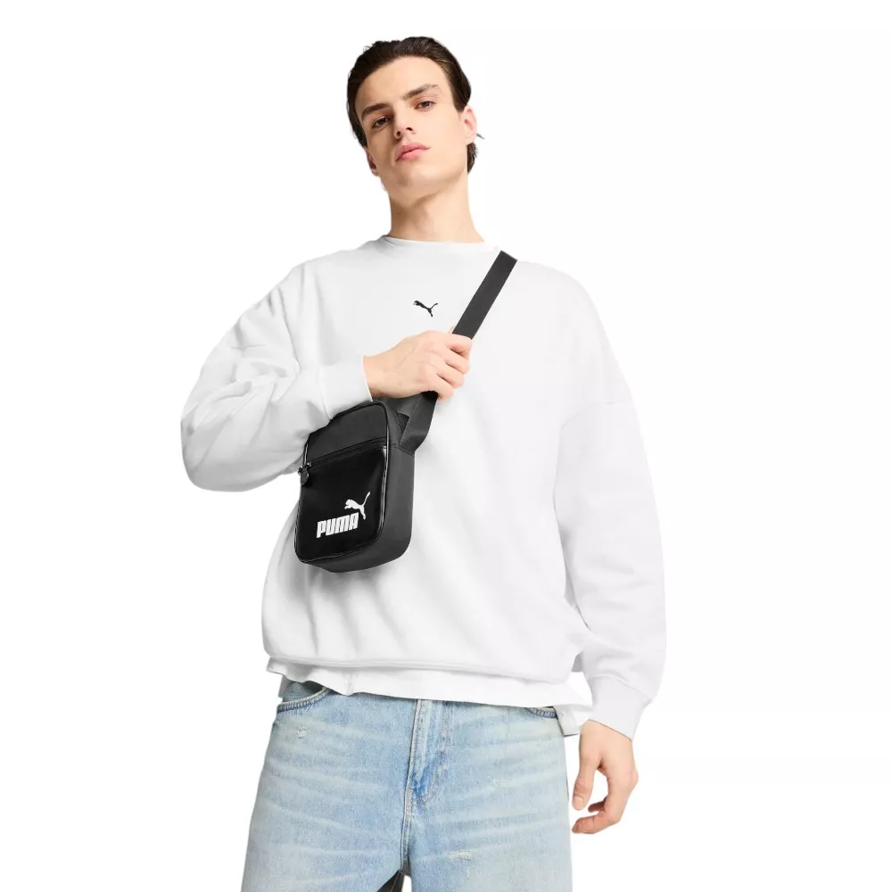 Original bandolera de Puma con diseño en color negro. Combina distintos acabados en poliéster y cuero. Detalle de ribete en blanco para un toque retro. – Cinta ajustable. – Cierre de cremallera. – Medidas: 14x19x5,5cm (alto x ancho x profundidad). – Capacidad 1,5