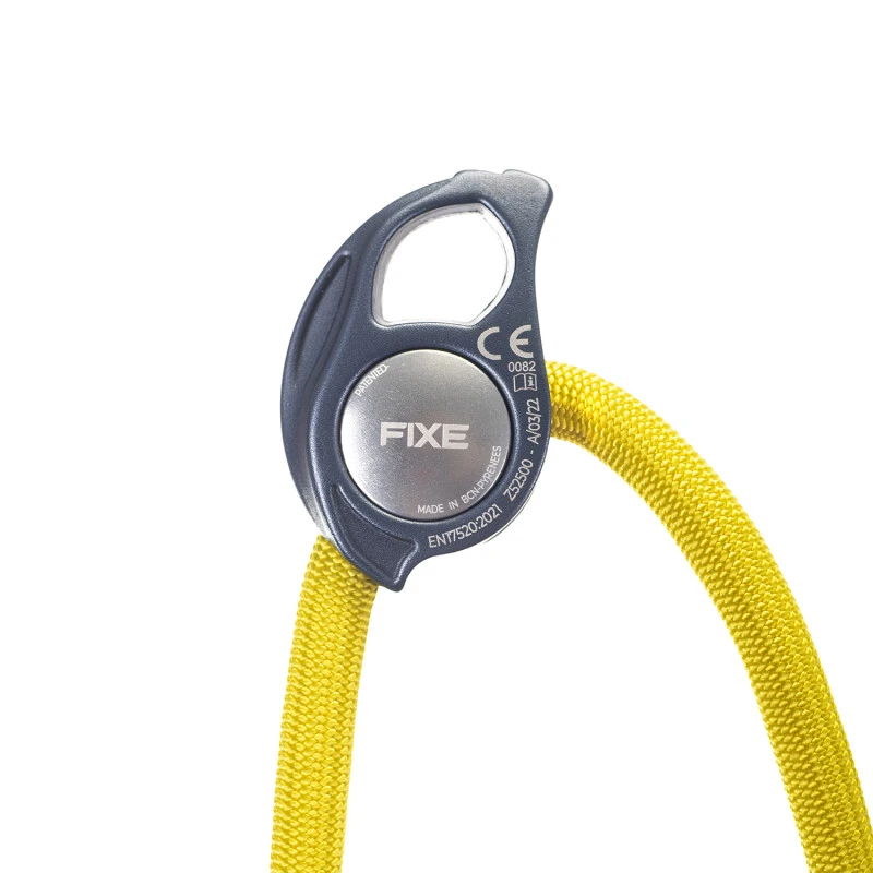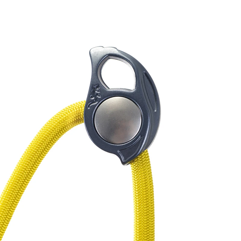 - Evita la carga en el eje menor del mosquetón gracias al anillo de caucho (elemento incluido en el dispositivo). Se recomienda utilizar con un mosquetón HMS de seguridad.