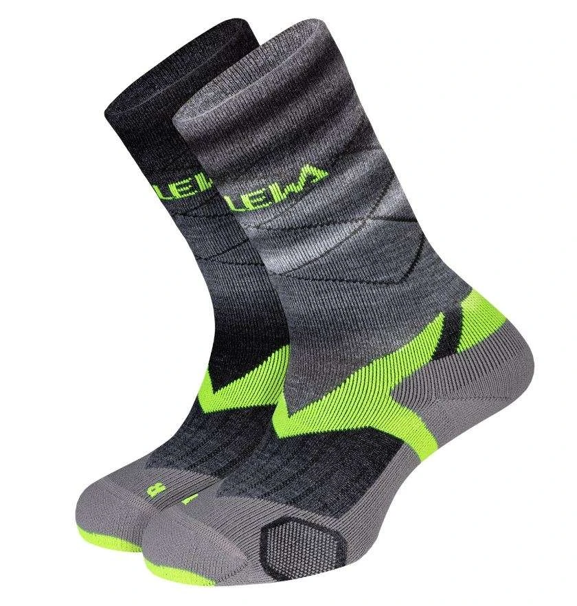 Calcetines para trekking transpirables y de secado rápido hechos de lana merino, acrílico y poliamida.