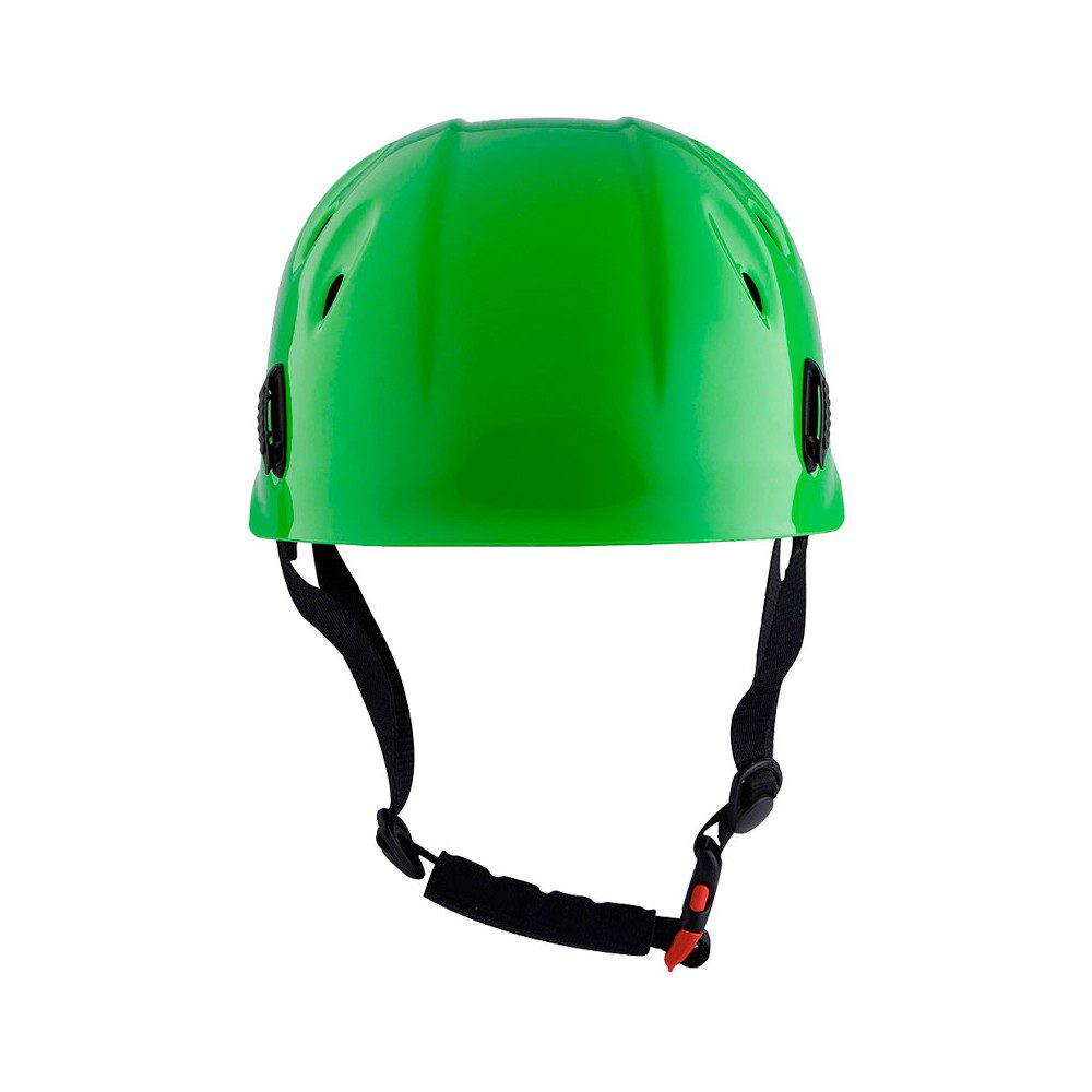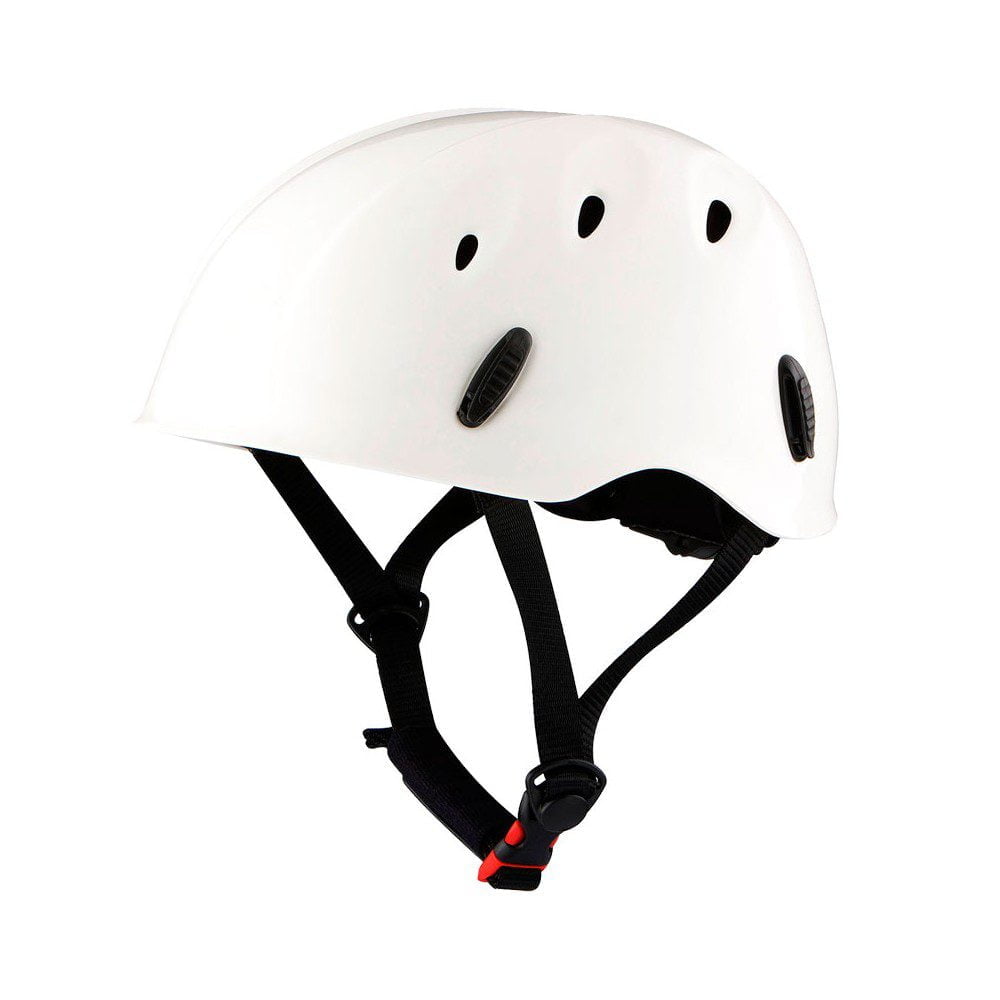 Cinta alrededor de la cabeza regulable mediante roldana posterior. La cinta del cuello se cierra con clip y se puede regular. Protección antiabrasión en la barbilla. 6 agujeros para ventilación y evacuación de agua en barranquismo.