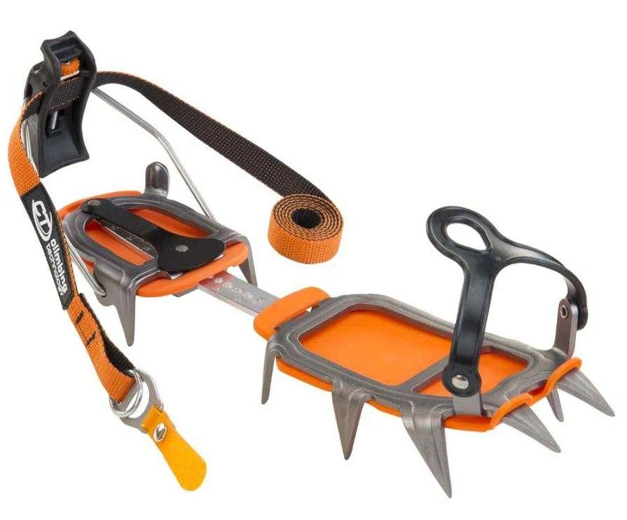 Crampones de montaña de 12 puntas de duraluminio con fijación semiautomática para alpinismo técnico y glaciares.