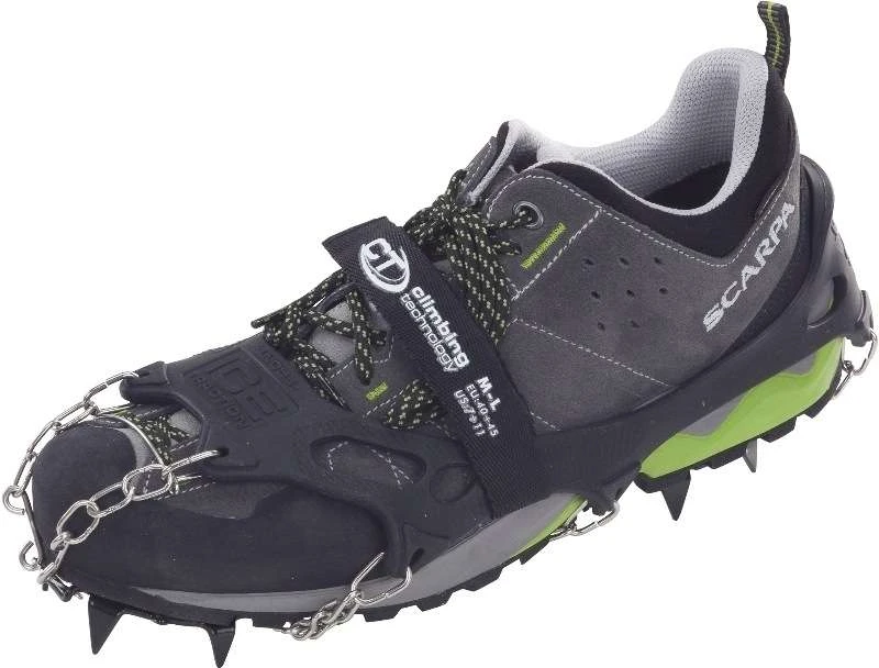 - 10 puntas de acero templado (6 en la parte delantera y 4 en la talonera), las cadenas son de acero templado.