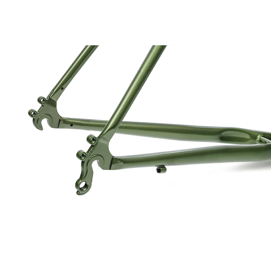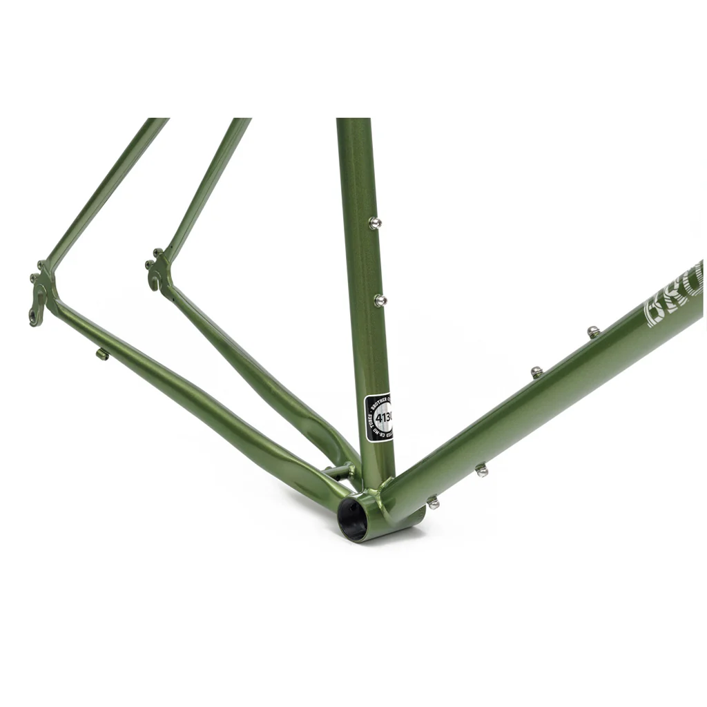 El cuadro está fabricado en acero al cromo-molibdeno 4130 de doble conificado, un tubo funcional que proporciona el equilibrio perfecto entre rendimiento y durabilidad. Está totalmente equipada para montar portabultos delanteros y traseros, guardabarros y tiene tres posiciones de montaje de bidones en todos los tamaños. La horquilla está diseñada para soportar peso en la parte delantera en caso de que desees montar una bolsa delantera estilo randonneur, y puede llevar un portabultos estilo porteur o low rider si lo deseas.