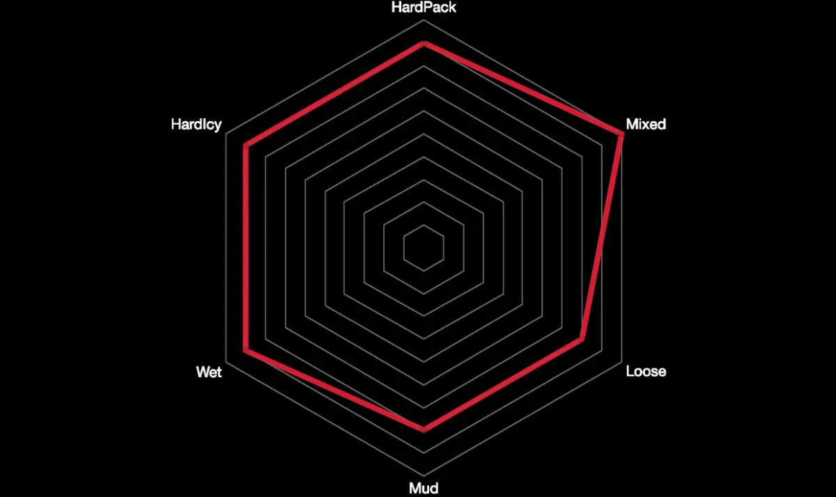 Los tacos laterales también son altos para mejorar el agarre. Cuentan con un compuesto más blando en el interior y más duro en el exterior. Por lo tanto, se deforman lo suficiente para seguir en contacto con el terreno al tiempo que ofrecen un agarre sólido. En la zona intermedia la cubierta cuenta con un taqueado blando que facilita la evacuación de barro y arena además de servir de apoyo en curvas rápidas.