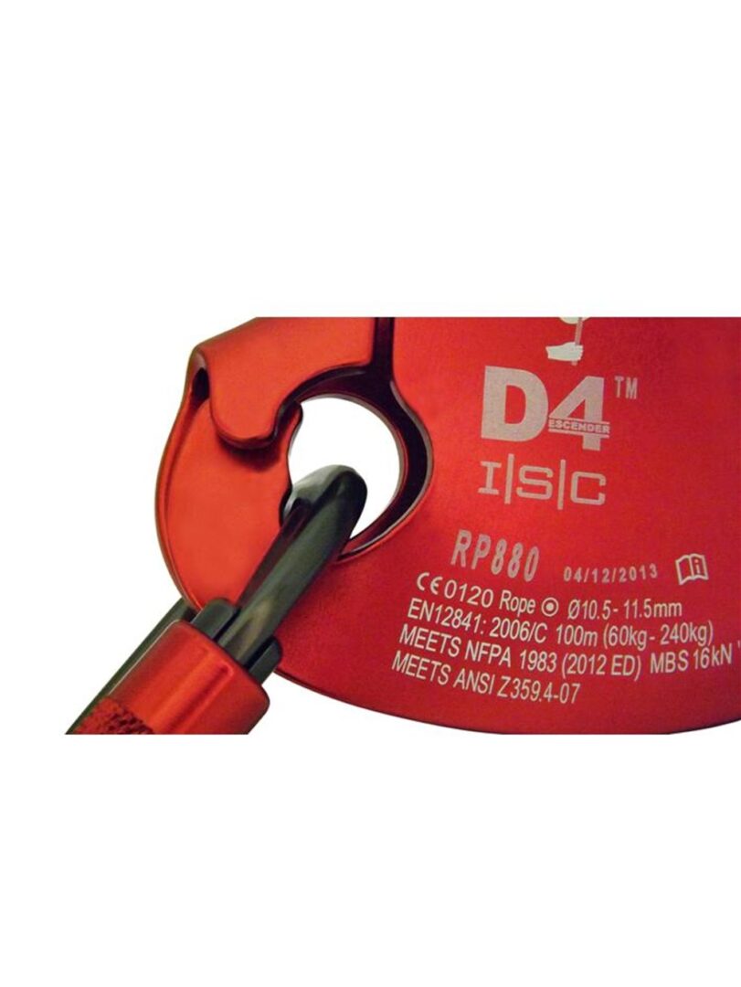 La leva D4 está hecha de acero inoxidable sólido superduro y es altamente resistente al desgaste y a la corrosión. El D4 cumple con las normas CE, NFPA T y ANSI Z359.4 para los mercados mundiales de acceso por cuerdas y rescate, que suelen utilizar cuerdas de 10,5 mm / 11 mm.