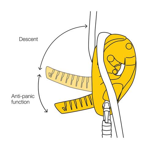 – Empuñadura ergonómica que permite liberar la cuerda y controlar cómodamente el descenso. Dos modos de descenso posibles: sobre la placa lateral o en la garganta de frenado en V.