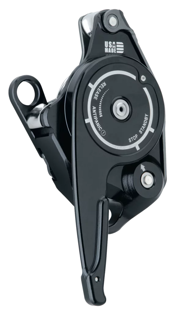 La carga / descarga de la cuerda se asegura con una innovadora placa lateral de doble pestillo que es independiente del punto de fijación del dispositivo.