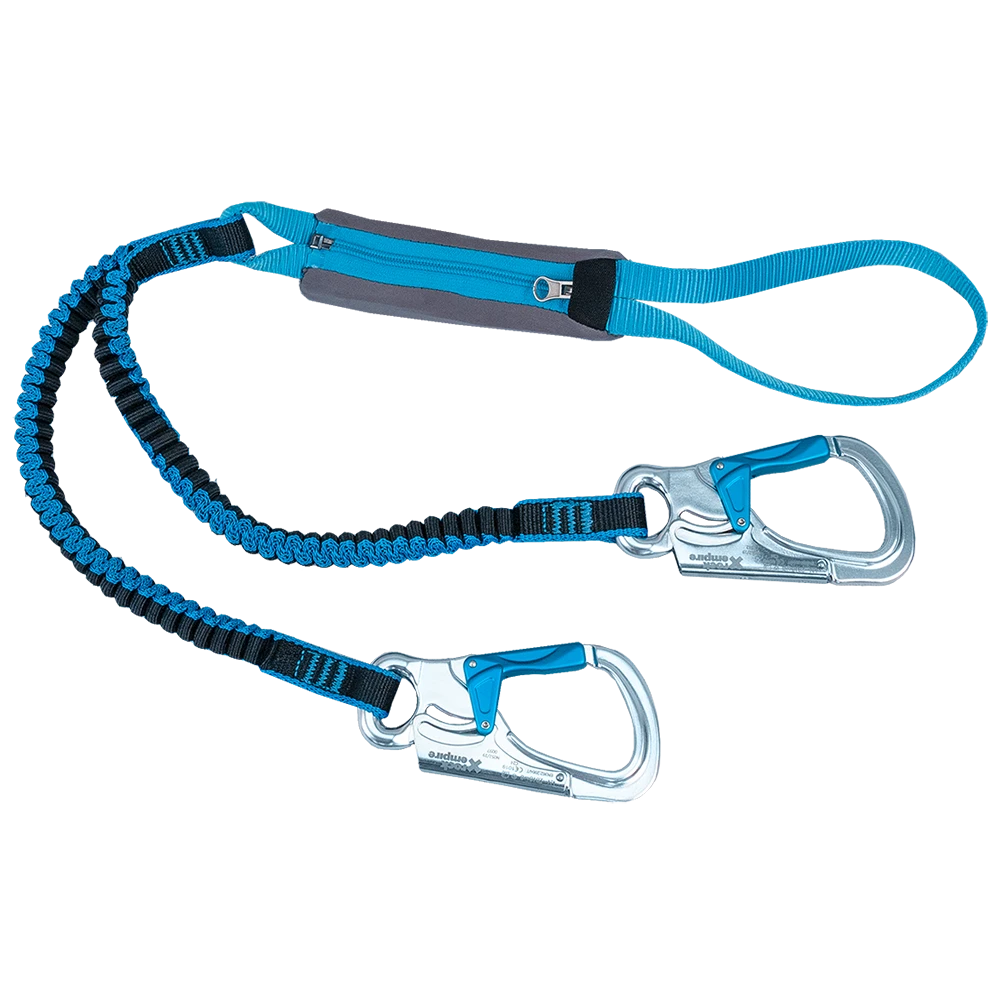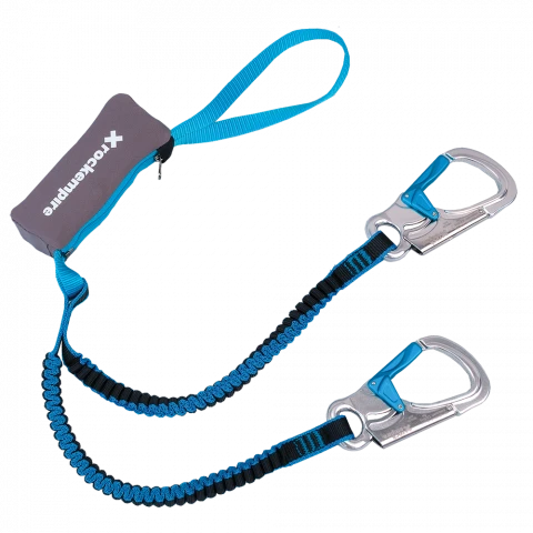 - Incorpora mosquetones con cierre de seguridad automático tipo K, según normativa EN 12275 y los brazos elásticos con una longitud de 50 cm en normal y de 90 cm en extensión.
