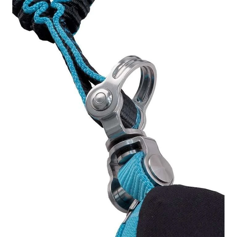 - Incorpora mosquetones con cierre de seguridad automático tipo K, según normativa EN 12275 y los brazos elásticos con una longitud de 50 cm en normal y de 90 cm en extensión.