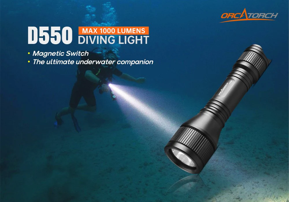 - OrcaTorch D550 es una luz de buceo con interruptor magnético de cola pequeña y ligera. Está equipado con un interruptor de cola controlado magnético sellado que ofrece alta impermeabilidad y fácil operación bajo el agua.