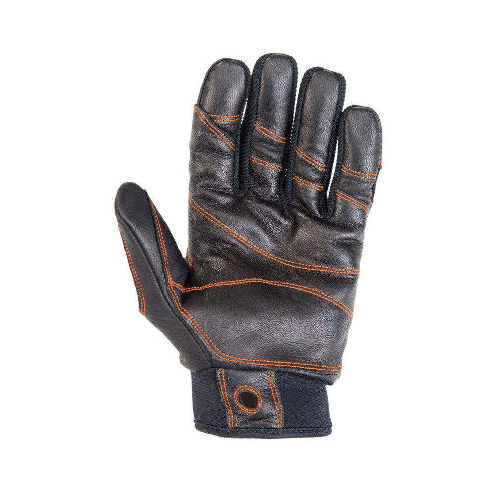 Están fabricados con una doble capa de piel natural en la palma y en el espacio entre pulgar e índice; dorso reforzado de piel con inserciones elásticas anti-abrasión, muñeca ergonómica con cierre de velcro y con práctico sistema para facilitar la extracción de los guantes.