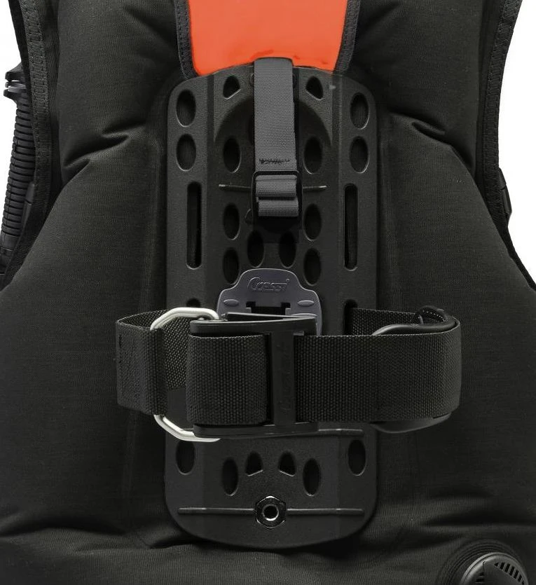 - Back Pack (espaldera) minimalista con espesores reducidos al máximo para aligerarla. Material ultrarresistente y semiflexible. Amortiguador en goma termoplástica para mejor fijación de la botella. Posibilidad de doble trincha. Incluye cincha de seguridad para fijación del chaleco a la grifería.