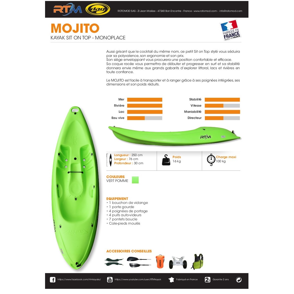 El Mojito es un kayak polifacético, diseñado para brindar comodidad, estabilidad y polivalencia en diferentes actividades acuáticas. Su asiento envolvente y pequeño asiento para niños lo hacen ideal para paleo y paseos en familia en aguas tranquilas. También cuenta con un diseño de casco adecuado para iniciarse en el surf y una estabilidad que inspira confianza en salidas costeras. Es fácil de transportar debido a sus asas integradas, dimensiones reducidas y peso ligero.