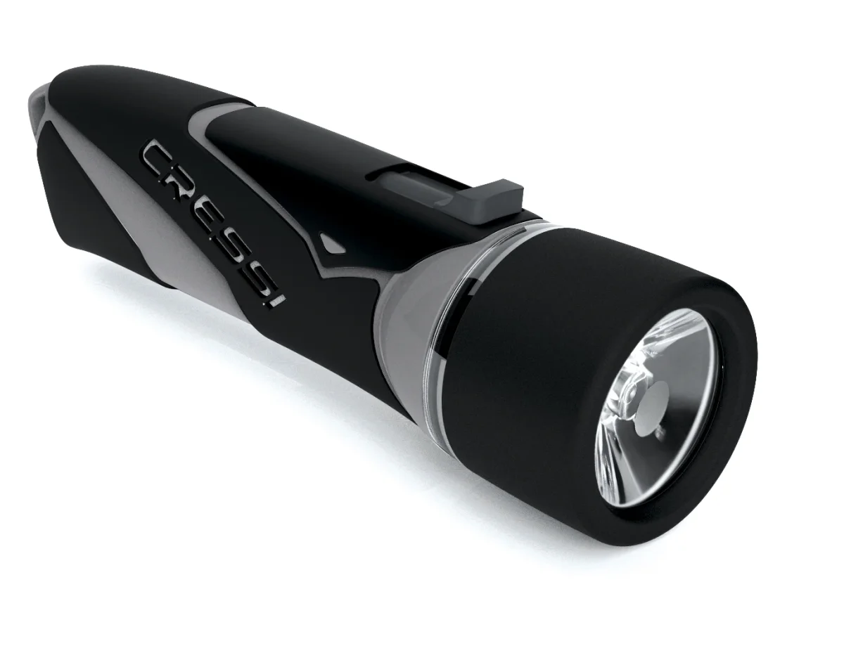 - Sistema electrónico desarrollado por Cressi Elettronica que estabiliza las diferencias entre los diferentes potenciales eléctricos de diferentes tipos de baterías y asegura una eficiencia de 30% más alto que los sistemas comúnmente utilizados. Emite una señal de advertencia mediante parpadeo en el momento de sustituir las pilas (carga restante 20%) y está equipado con apagado automático de emergencia. Disipador de calor metálico.