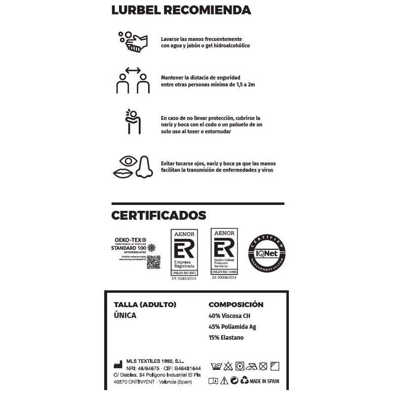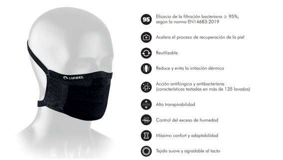 - La mascarilla Lurbel Faz está desarrollada con la novedosa Tecnología Regenactiv (textil patentado)que, en contacto con la piel, ayuda a mantener la integridad de la barrera cutánea, conservando su estado fisiológico natural y favoreciendo su recuperación ante agresiones externas.