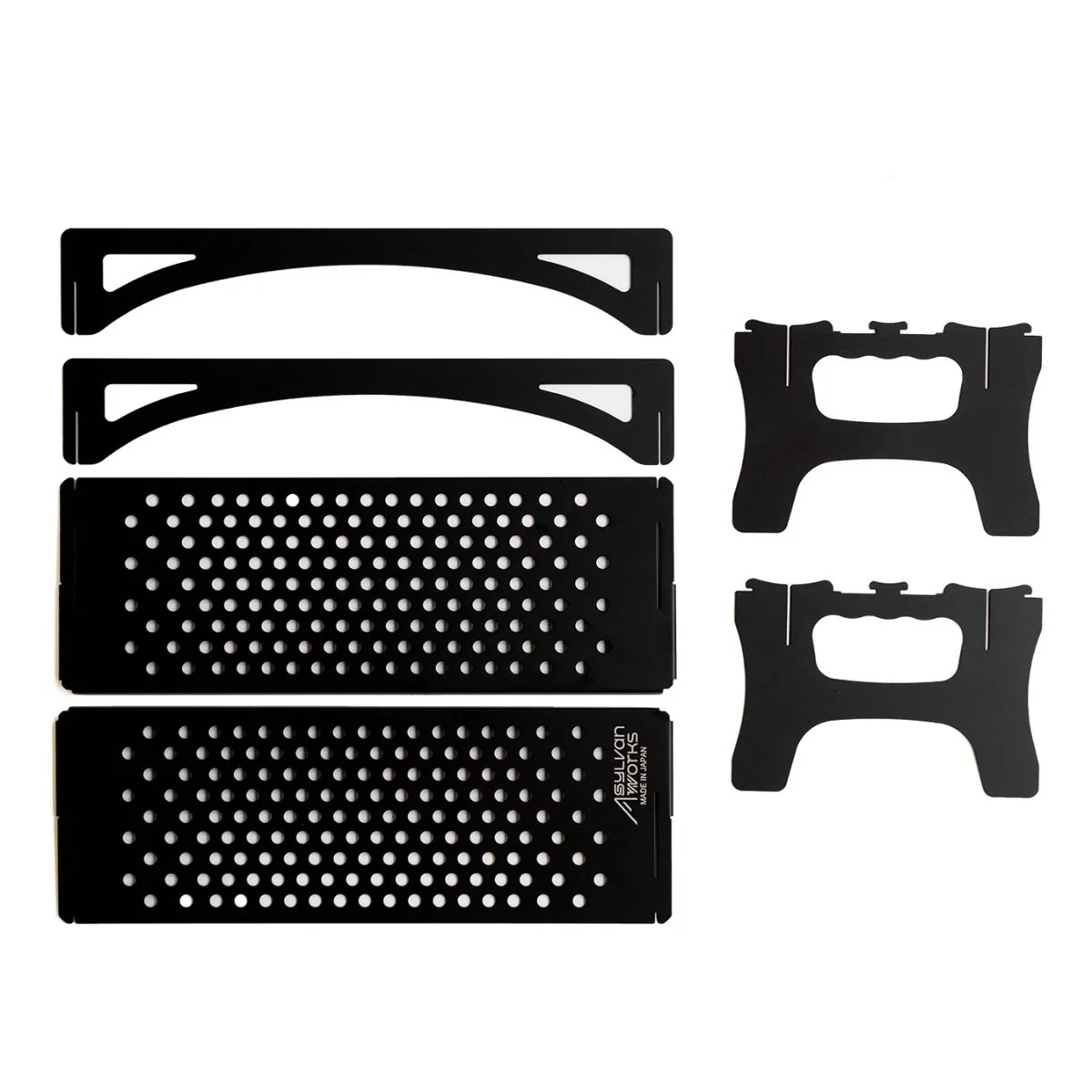 Cada una de las seis piezas de aluminio son finas y están cortadas con láser de precisión, y se apilan en un paquete compacto y ordenado que ocupa aproximadamente la mitad de una hoja A4. Toda la pila se puede asegurar con 2 bandas de silicona incluidas.