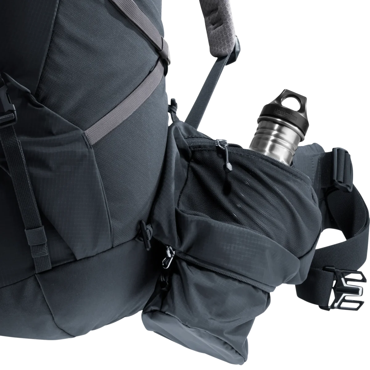 Muchos compartimentos interiores diferentes ofrecen una organización práctica del equipo. Los bolsillos exteriores ofrecen más volumen y organización para todo lo que hay que tener a mano. Incluso para postes de tiendas de campaña, entre otras cosas. Los amplios bolsillos desmontables de las aletas lumbares también proporcionan más espacio de almacenamiento; incluso para una botella de agua de 1,5 litros en un bolsillo adicional desplegable. El acceso rápido a través de la abertura frontal y el espacioso compartimento inferior facilitan su manejo. La tapa extraíble puede convertirse en una mochila de diario con hombreras en un abrir y cerrar de ojos.