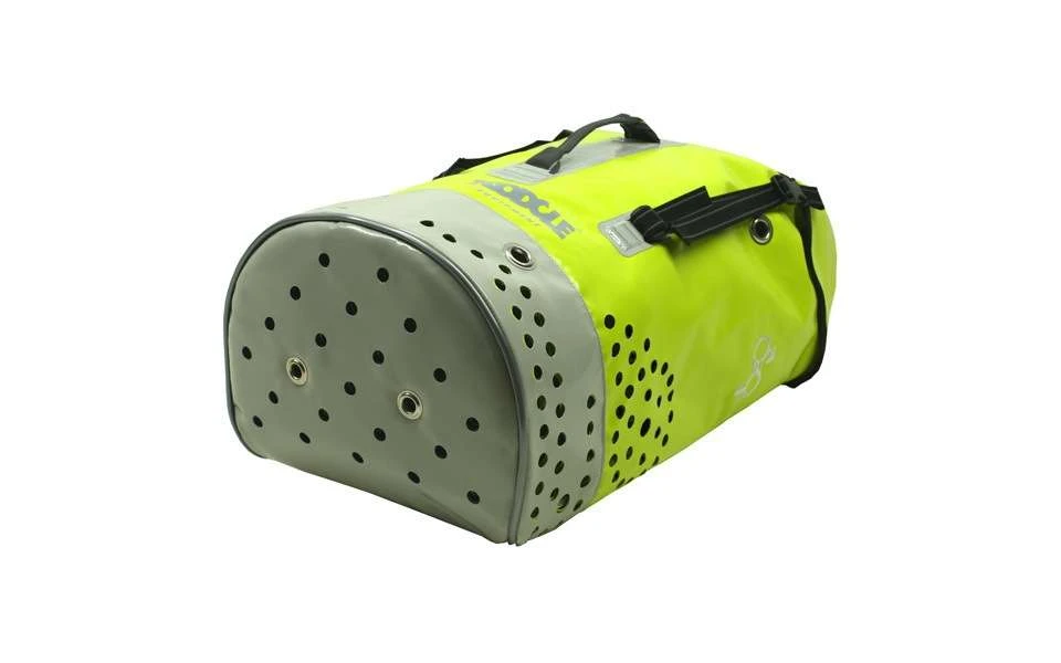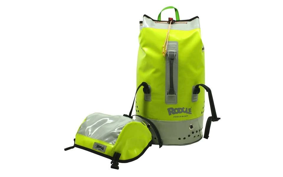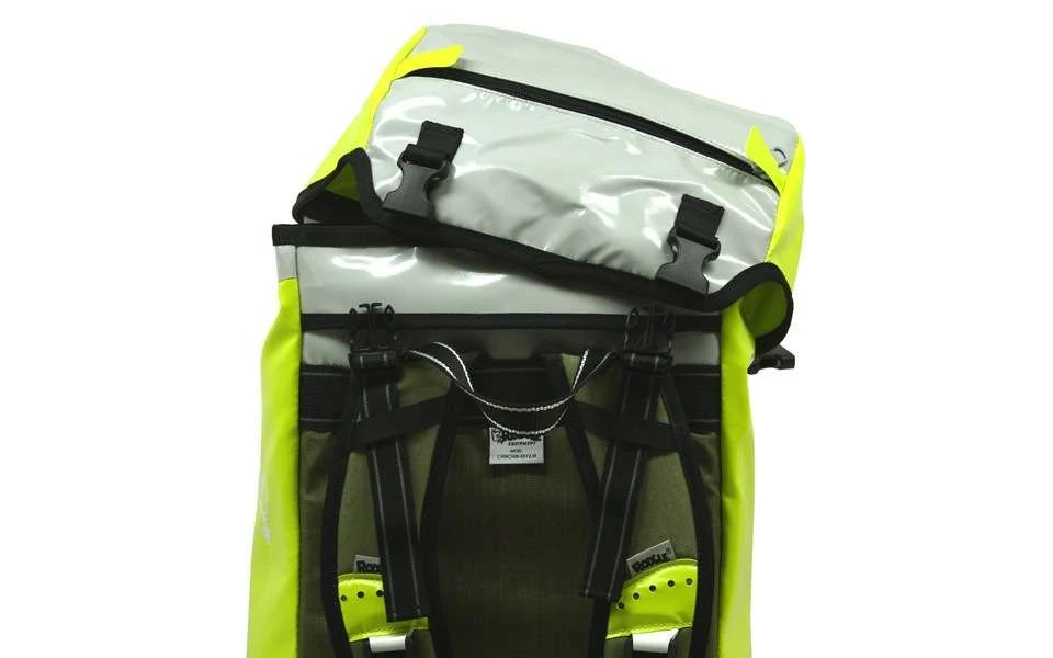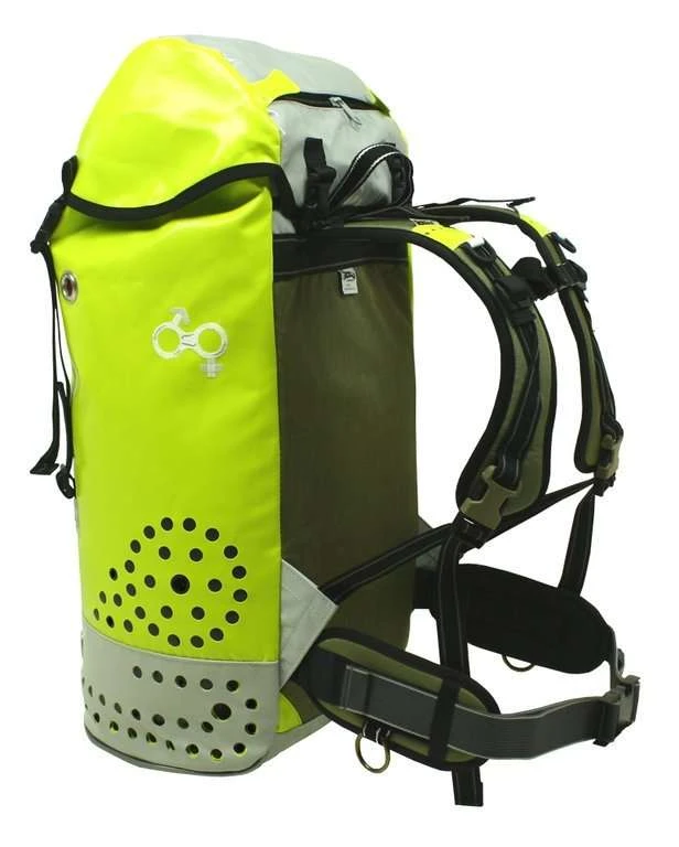 - Cintas portamaterial en ambas hombreras y cinta de enganche para un mosquetón. Con este mosquetón se facilita el plegado de la cuerda de progresión, en el interior de la bolsa flotante para cuerda modelo SERA.