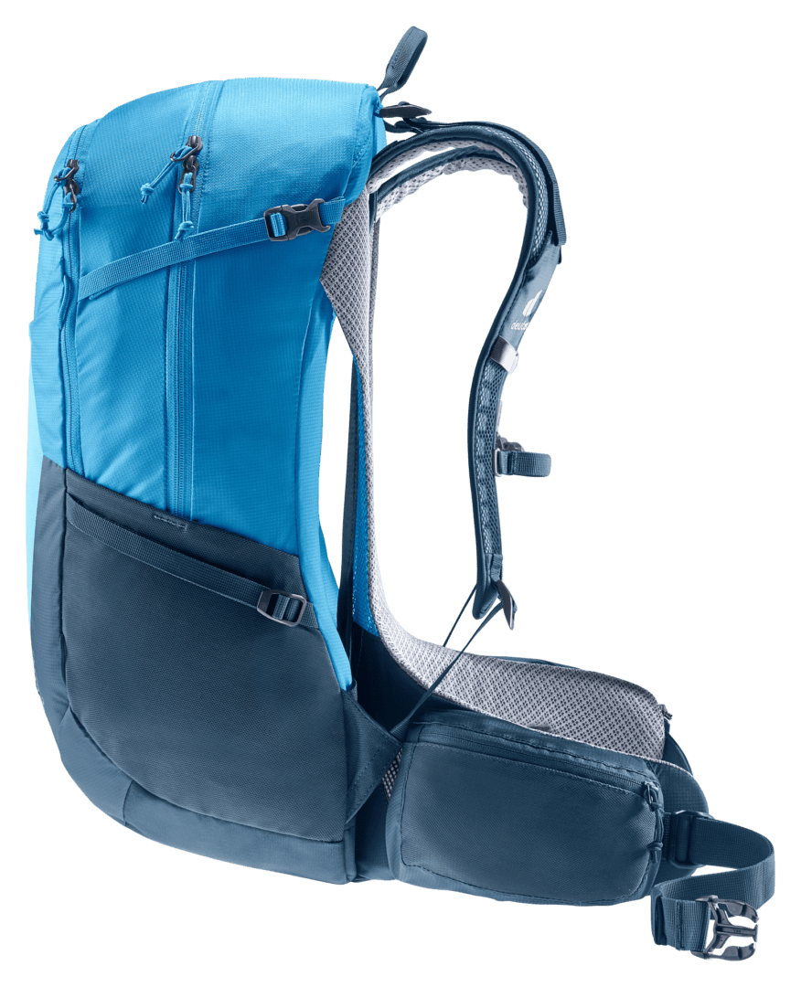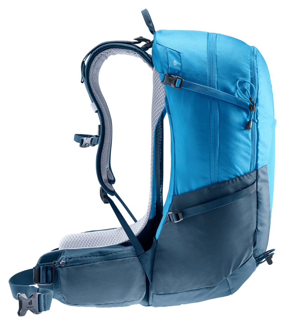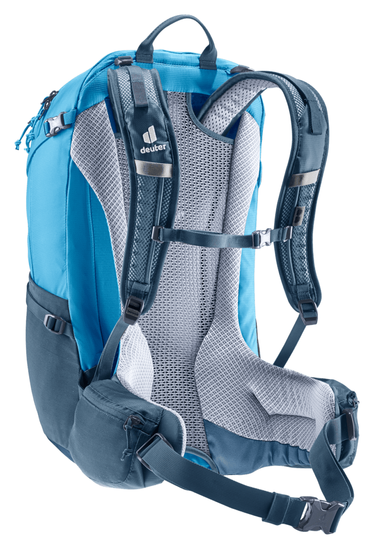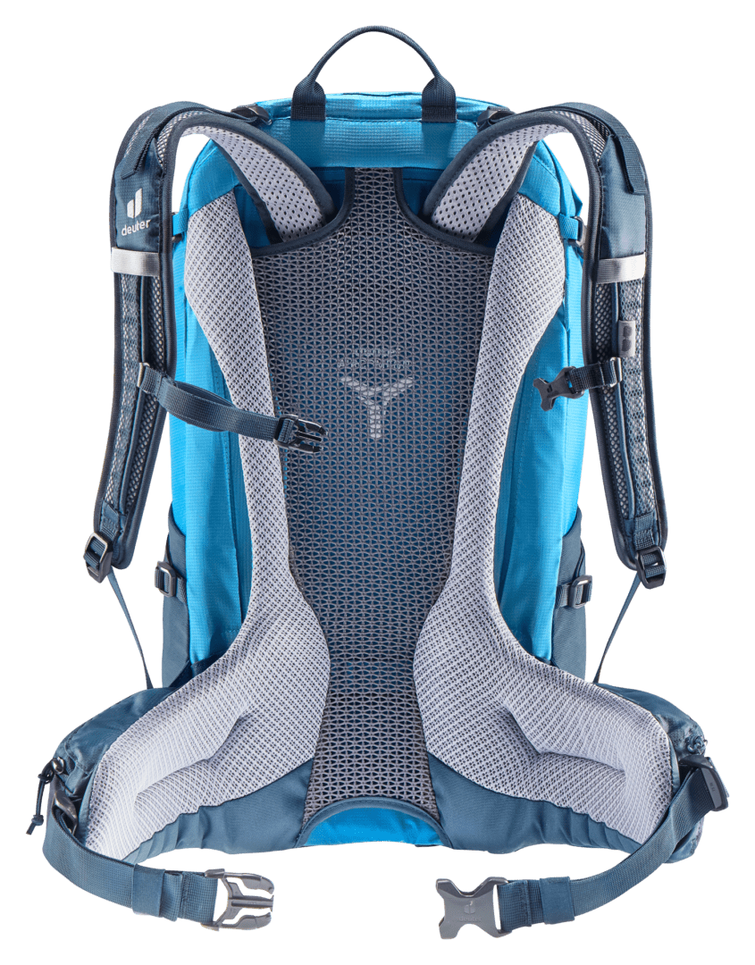 Este nuevo sistema de malla en la espalda aúna ventilación máxima, confort ergonómico y ligereza. La innovadora estructura de los alerones de las caderas y su fluida transición a la malla de la espalda recogen el cuerpo y aseguran un ajuste cómodo. La estructura con marco flexible, hecha de un plástico permanentemente elástico y de acero irrompible, le aporta tensión estable a la malla de la espalda Aircomfort. Crea un espacio de ventilación fiable entre la mochila y la espalda, por el que la humedad del aire se puede evaporar libremente. Con el sistema de ventilación patentado de tres lados de Deuter, se suda un 25 %* menos al llevarla. La gran flexibilidad de su estructura ofrece total libertad de movimiento a quien la lleva.
