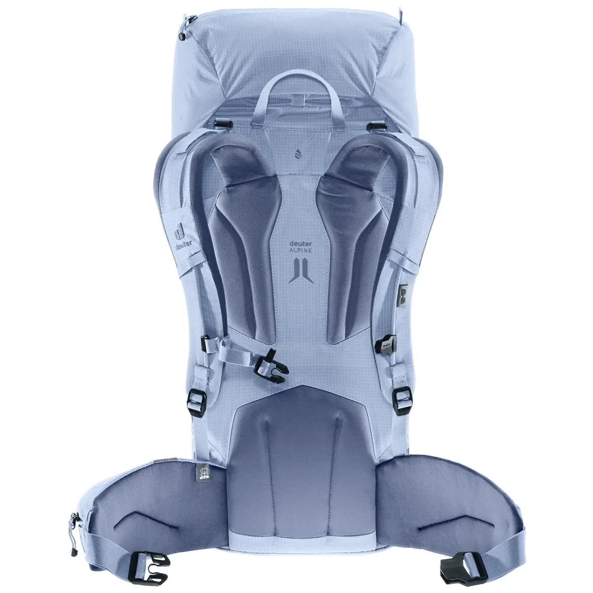 El sistema dorsal Alpine combina un ajuste firme y seguro con un buen control de la carga para poder concentrarse en terrenos exigentes. La ergonómica placa dorsal de PE con un bastidor de acero cosido permite que la mochila conserve su forma independientemente de la carga que lleve. De esta forma se optimizan tanto la estabilidad como la comodidad a la hora de llevarla con un peso reducido. Las correas de compresión laterales fijan el volumen de la mochila al centro de gravedad del cuerpo.