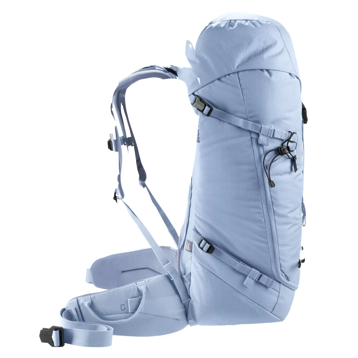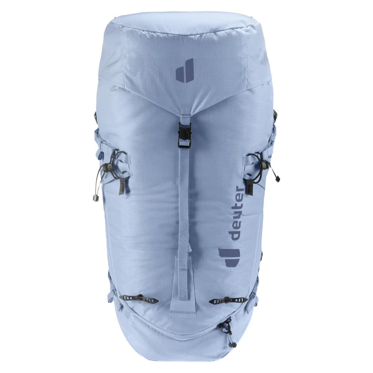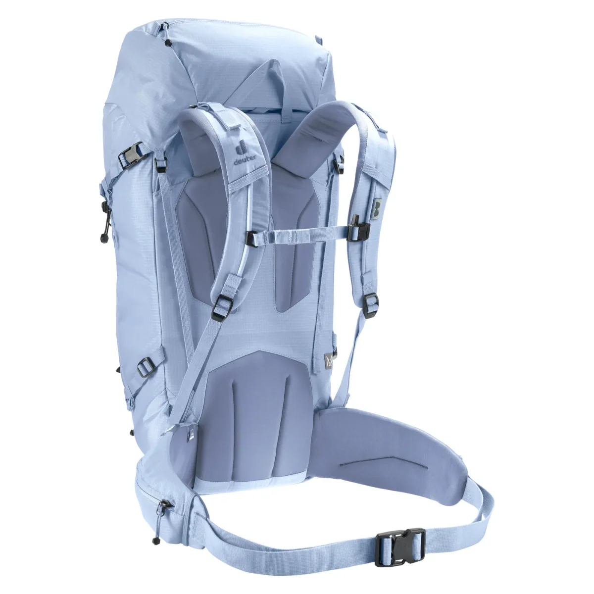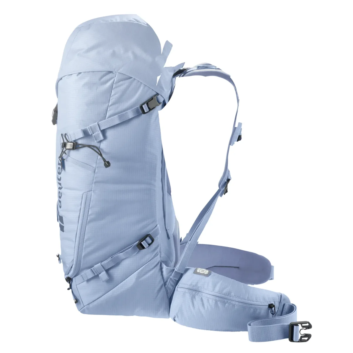 Las aletas lumbares desmontables y la estructura de la tapa, las correas de sujeción y de material, la sujeción para piolets en ambos lados, la sujeción para esquís en el lateral, la correa para cuerda, el portacascos de malla y el volumen ampliable convierten a esta mochila en todo lo que un alpinista necesita. Ya sea con un arnés en pasajes expuestos, con esquíes fijados durante la empinada subida a una cumbre o ante otros desafíos alpinos, las posibilidades de uso de esta mochila son casi ilimitadas.