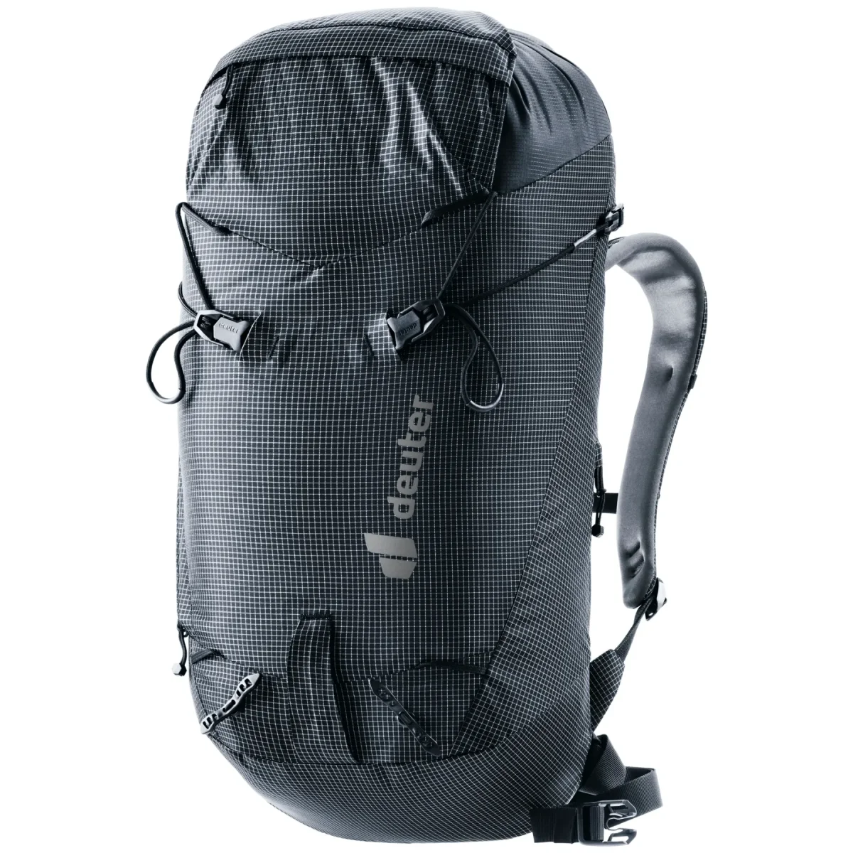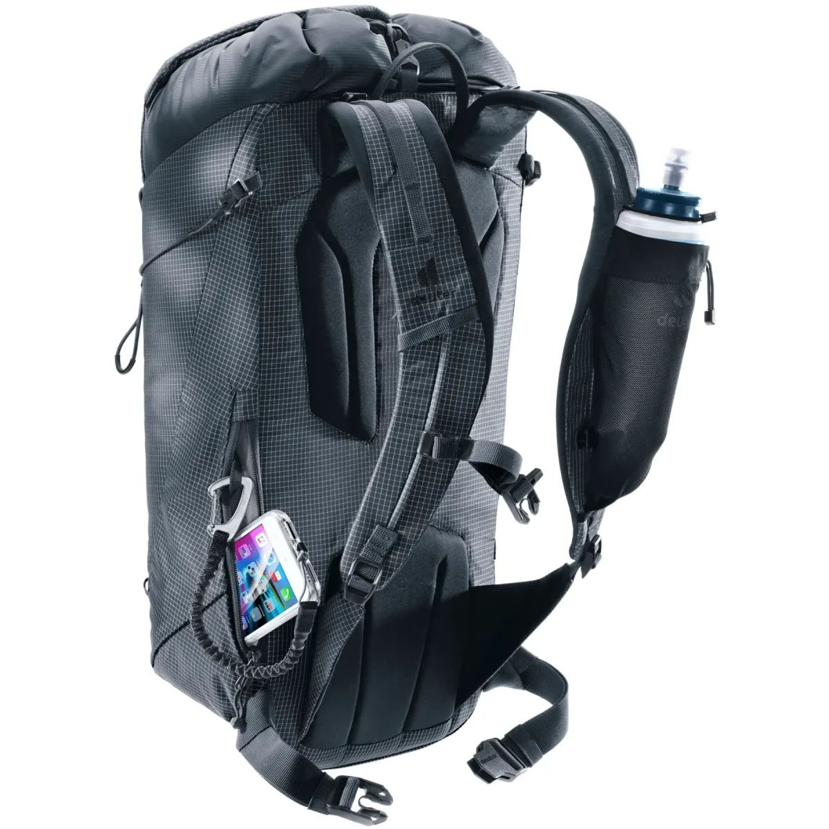 El estrecho cinturón, el portacascos de malla desmontable, las prácticas correas de sujeción, la sujeción para piolets en ambos lados y la correa para cuerda no solo establecen una excelente relación entre comodidad y peso, sino que también permiten llevar un arnés de escalada y ofrecen una flexibilidad extra para el uso de la mochila.