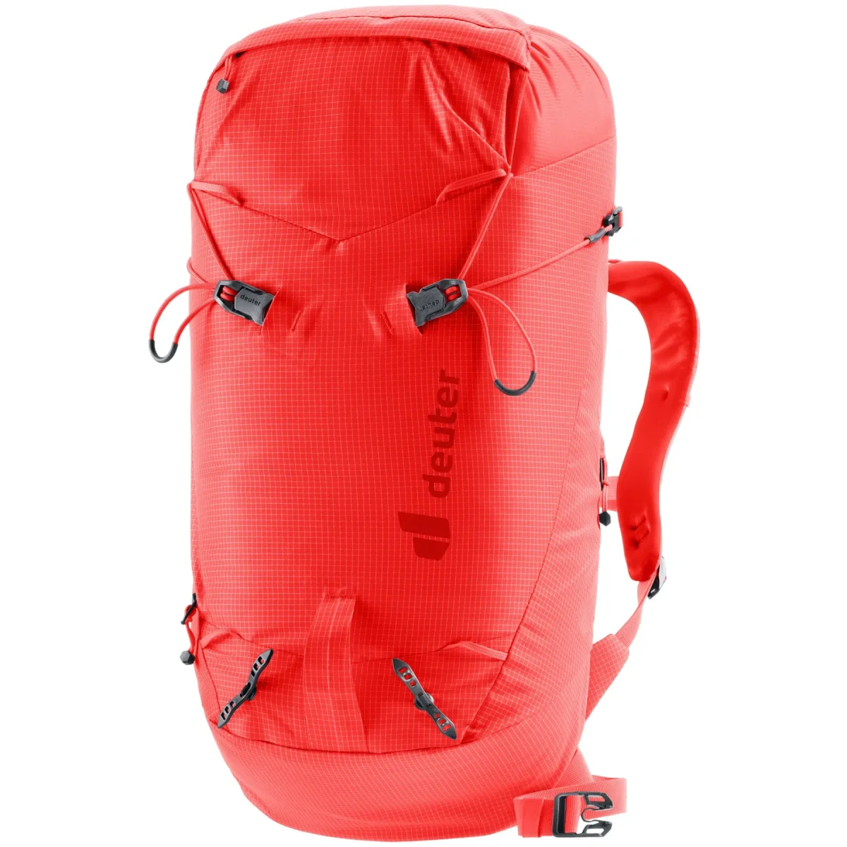 El estrecho cinturón, el portacascos de malla desmontable, las prácticas correas de sujeción, la sujeción para piolets en ambos lados y la correa para cuerda no solo establecen una excelente relación entre comodidad y peso, sino que también permiten llevar un arnés de escalada y ofrecen una flexibilidad extra para el uso de la mochila.