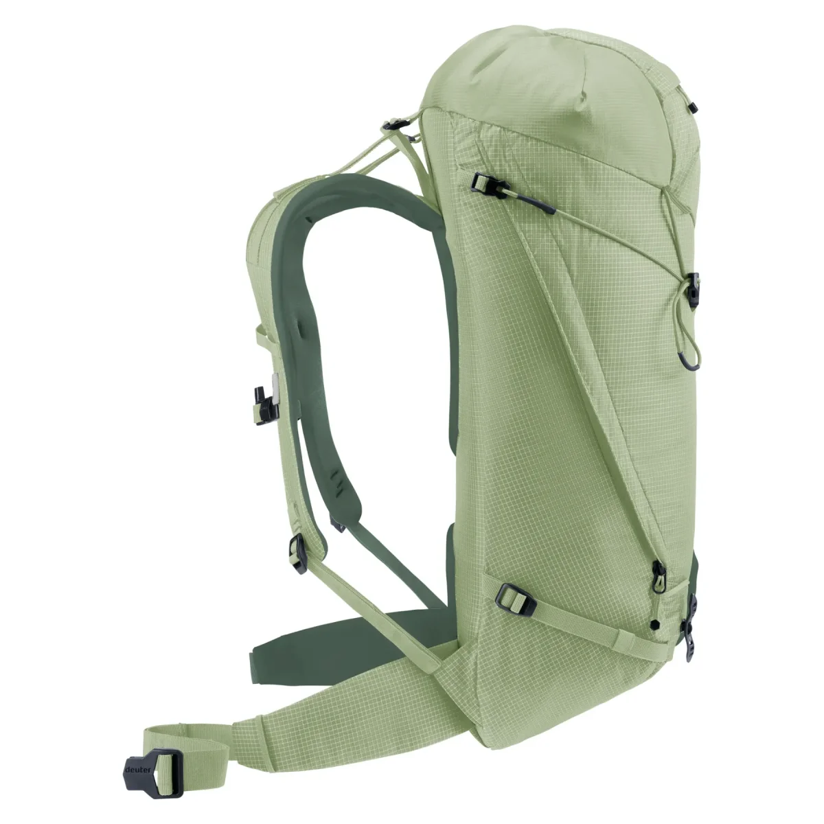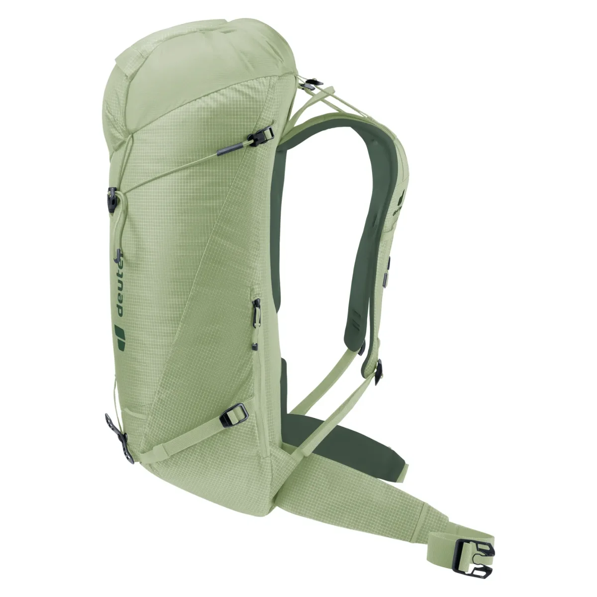 El estrecho cinturón, el portacascos de malla desmontable, las prácticas correas de sujeción, la sujeción para piolets en ambos lados y la correa para cuerda no solo establecen una excelente relación entre comodidad y peso, sino que también permiten llevar un arnés de escalada y ofrecen una flexibilidad extra para el uso de la mochila.