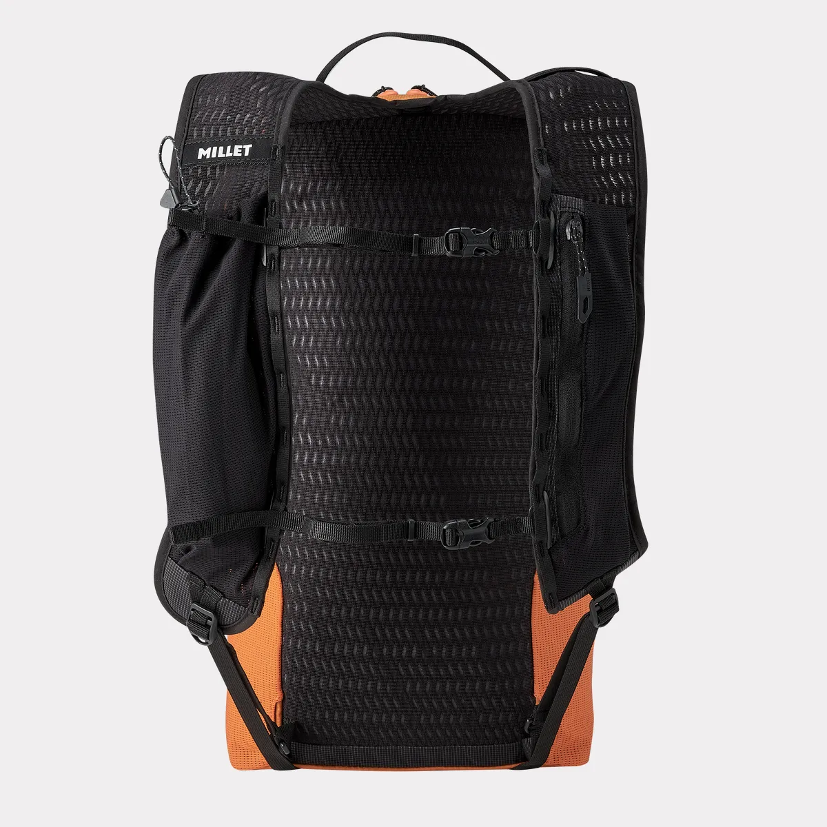 Mochila diseñada para salidas ligeras, con piolets o bastones, un bolsillo de hidratación en su compartimento dedicado y una botella de 500 ml al alcance de la mano.