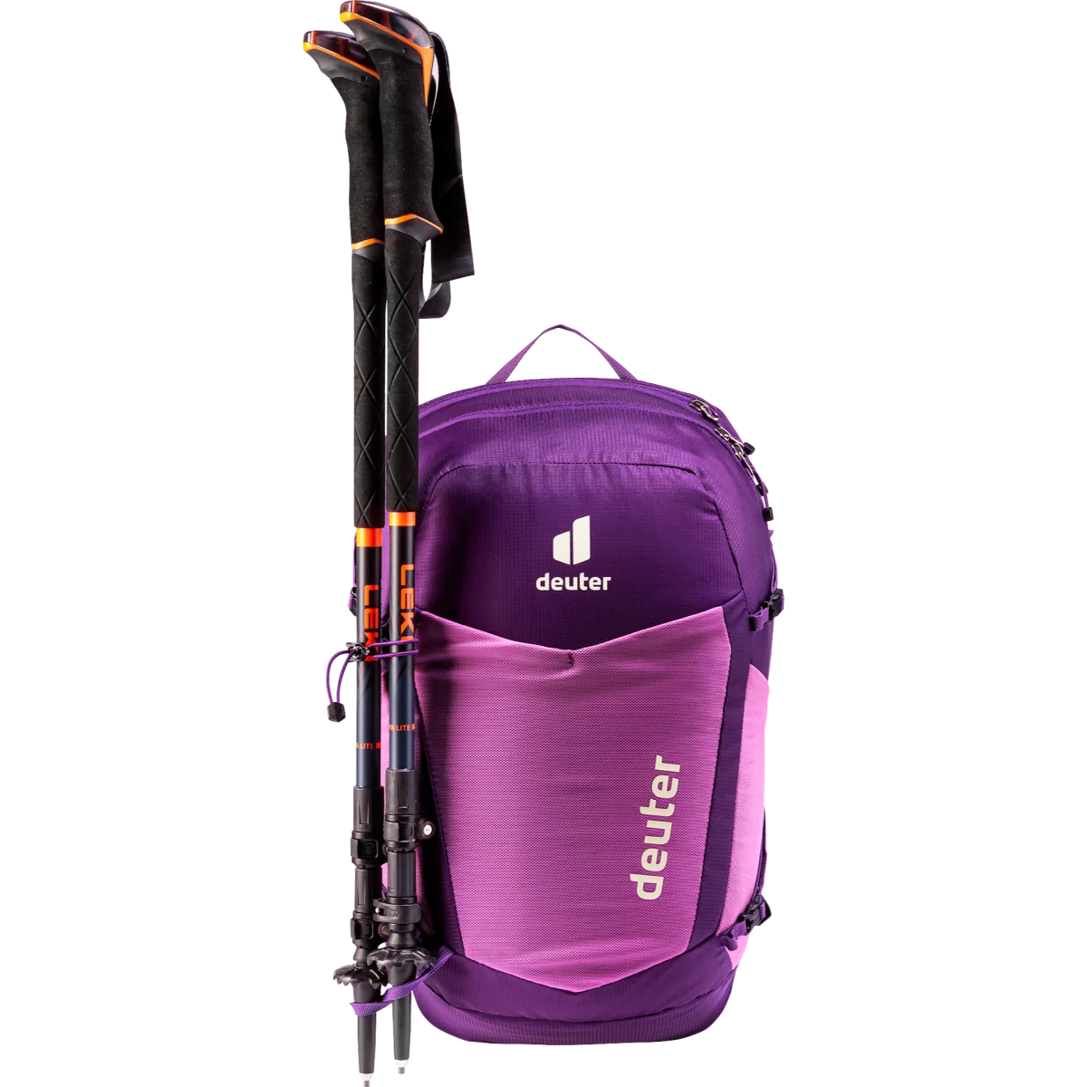 Los bolsillos integrados en las hombreras y los de las aletas lumbares ofrecen espacio suficiente para un botellín, una barrita, un teléfono móvil o un dispositivo GPS. Un sistema de fijación rápida de los bastones mediante lazos elásticos en las hombreras permite un acceso rápido y sencillo sin tener que quitarse la mochila. Así no hace falta parar.