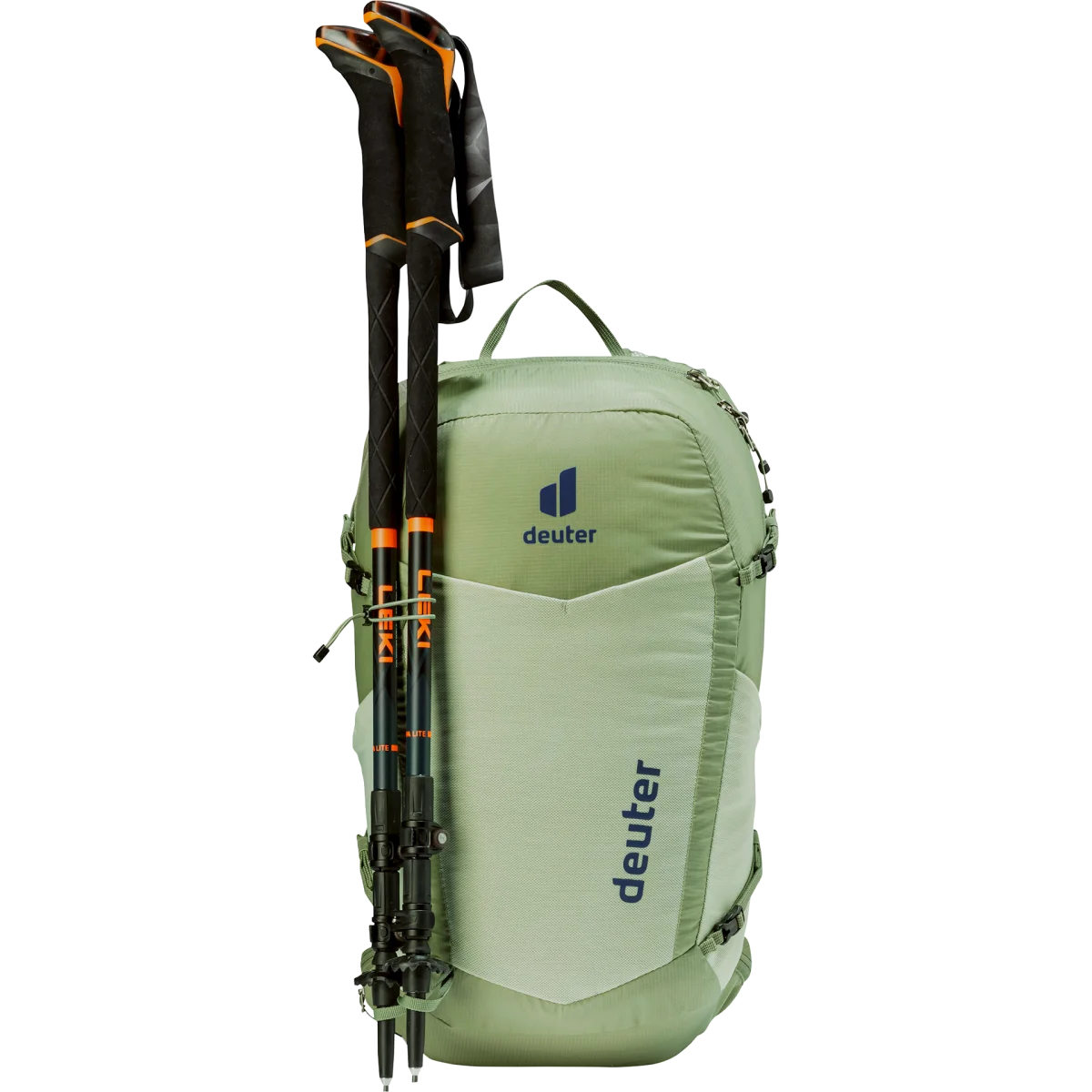 Los bolsillos integrados en las hombreras y los de las aletas lumbares ofrecen espacio suficiente para un botellín, una barrita, un teléfono móvil o un dispositivo GPS. Un sistema de fijación rápida de los bastones mediante lazos elásticos en las hombreras permite un acceso rápido y sencillo sin tener que quitarse la mochila. Así no hace falta parar.