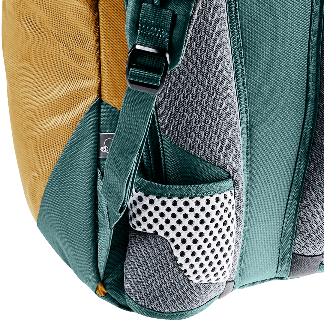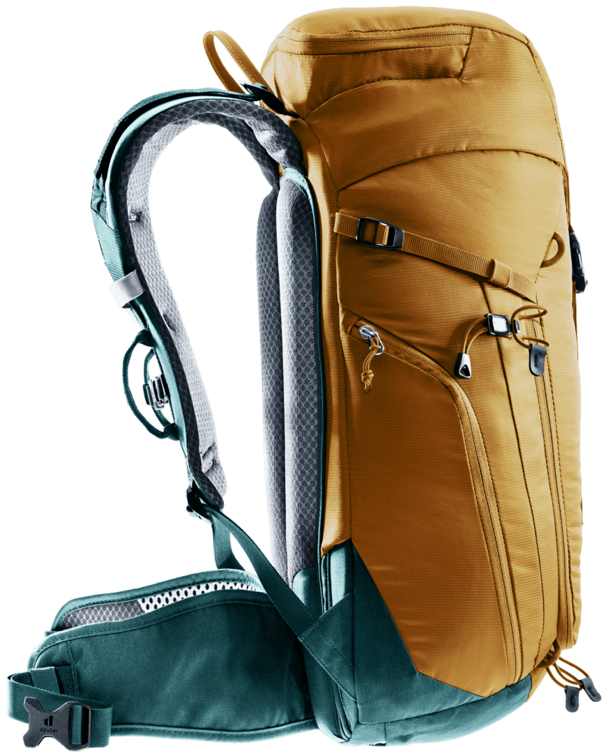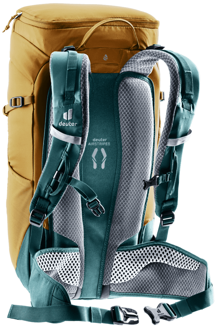 La reducida superficie de contacto y los grandes canales de ventilación del sistema de espalda Airstripes de Deuter, combinados con las correas de los hombros y las aletas de la cadera perforadas, garantizan el máximo flujo de aire. El sistema de espalda también distribuye el peso de la mochila cerca del cuerpo para un ajuste cómodo y seguro en cualquier terreno.