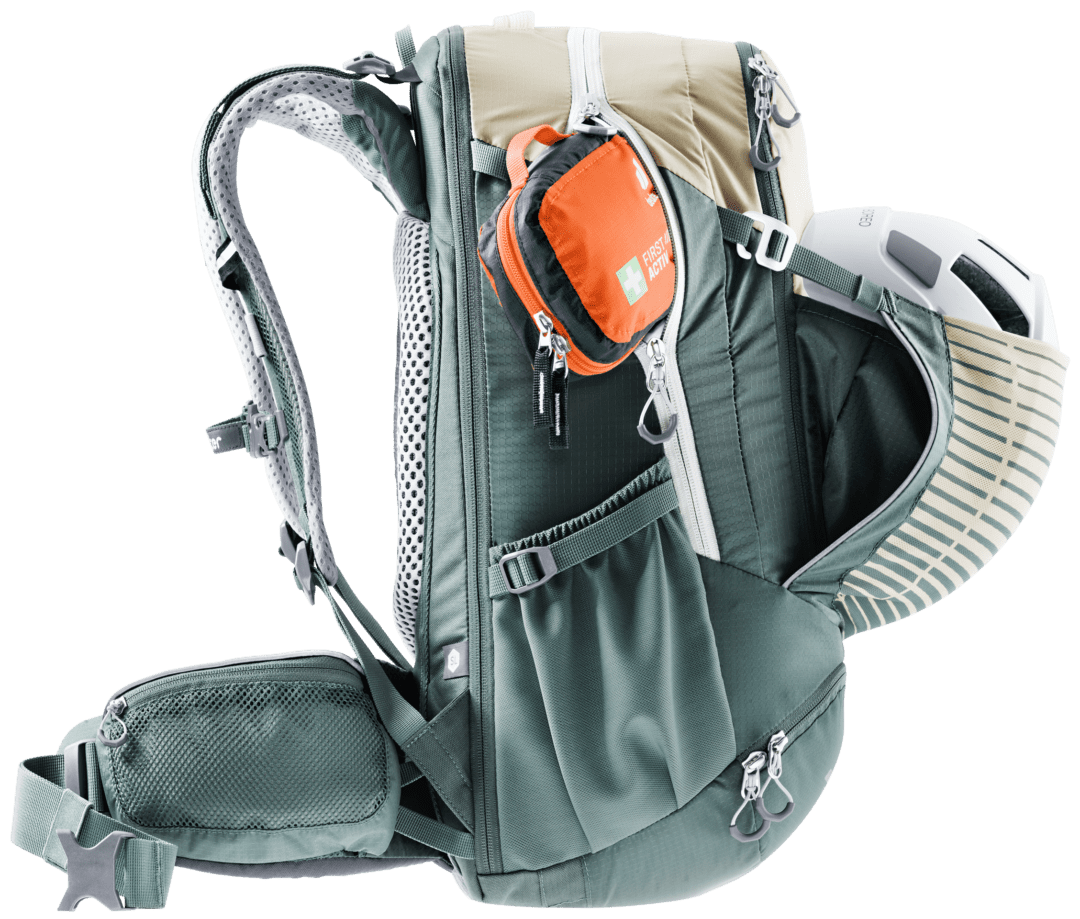 con todos los compartimentos aún accesibles. La fijación del portacascos con simples clips de fijación mantiene el casco fuera del camino cuando se carga la mochila.