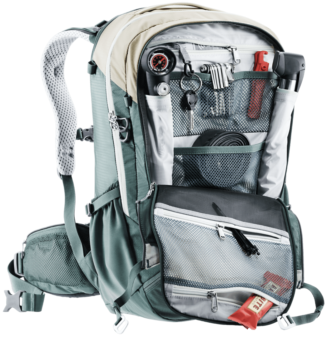 - Bolsillo frontal con gran sección organizativa y bolsillo de malla con cremallera para manguera, herramientas y soporte para bomba.