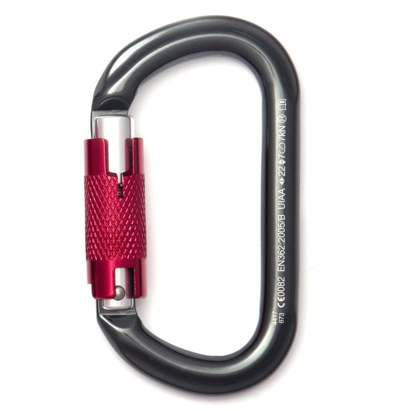 Mosquetón simétrico ancho con cierre automático ideal para uso con poleas y nudos.