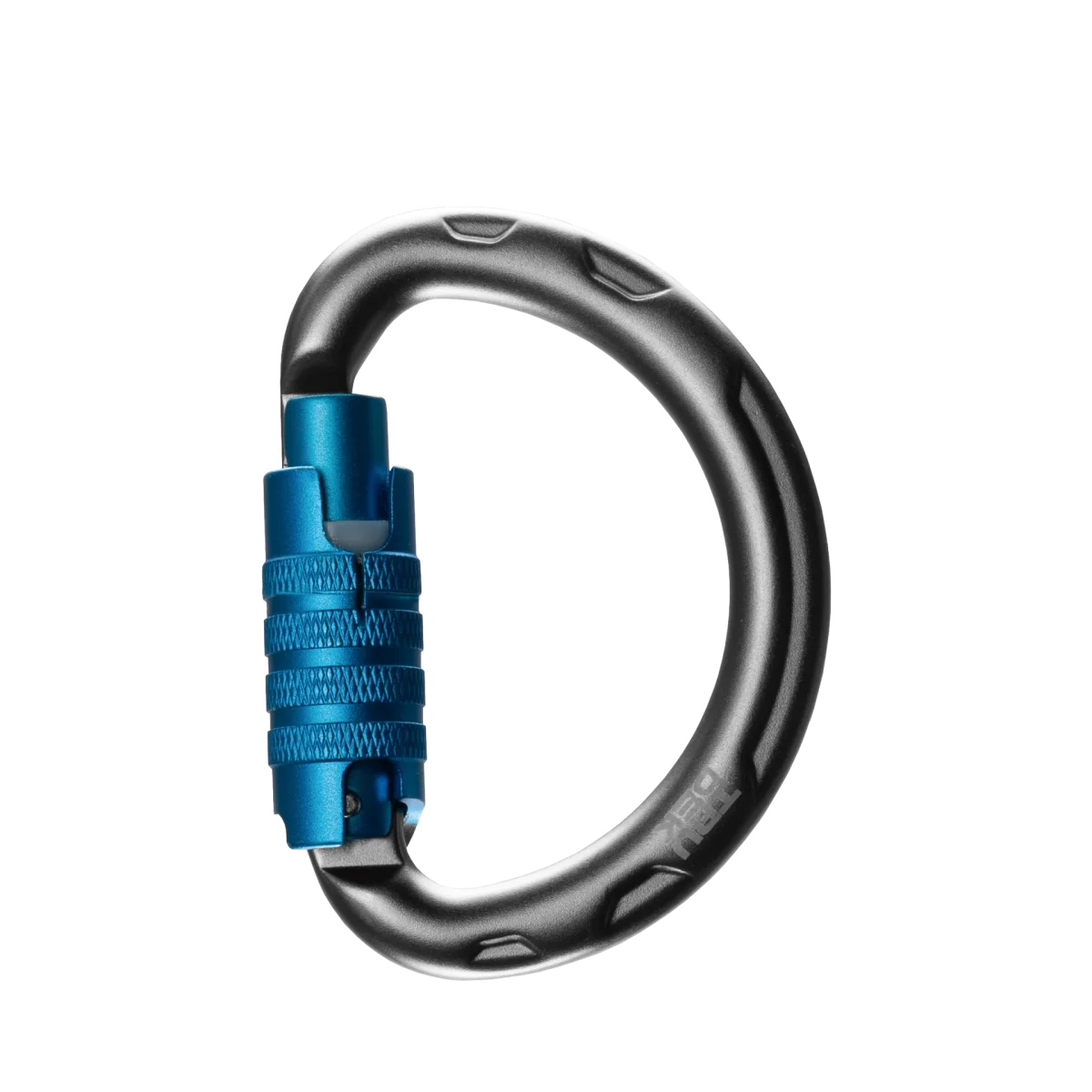 Mosquetón semicircular multidireccional EME Tri Lock que permite cerrar los arneses o conectar un bloqueador ventral.