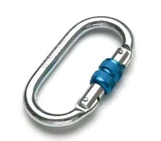 Mosquetón simétrico de acero con seguro de rosca para equipamientos, trabajos verticales y de rescate.